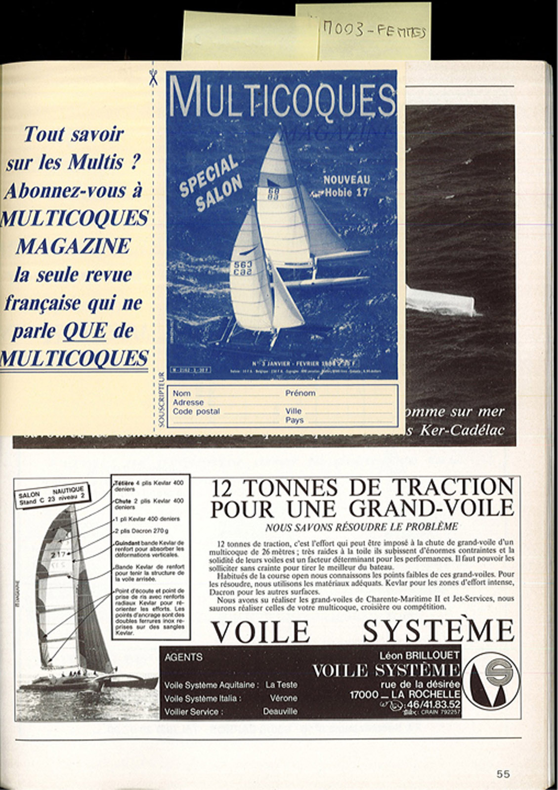 L’aventure peut commencer. « En mai-juin 1985, le numéro 0 est réalisé dans la cuisine d’André, dans son pavillon de Deuil-la-Barre, près de Paris, se souvient Gilles. Il est adressé aux membres de l’UNM, à mes clients des revues étrangères, aux associations de cata de sport, à des annonceurs potentiels, aux chantiers... On reçoit quelques commandes d’abonnement et quelques contrats publicitaires. Il faut désormais passer aux choses sérieuses et lancer la réalisation du no 1. Problème : aucun de nous n'a la moindre expérience de la fabrication d’une revue, de son édition, de sa distribution... Devant notre totale incompétence à réaliser une revue pro digne de ce nom, pour nous en sortir, nous faisons appel à un journaliste photographe nautique de l’agence SIPA, Gilles Klein. Il nous montre comment faire un chemin de fer (mise en page et contenu). Le numéro 1, avec en couverture une de ses photos de Formule TAG, est également créé dans la cuisine d’André, à l’aide de ciseaux et de bâtons de colle. Suite à un accord avec la Chambre de Commerce et d’Industrie, en tant que créateur d’entreprise, André trouve un bureau à Cergy-Pontoise, bénéficiant d’un secrétariat commun, photocopieuse… le must. Plusieurs numéros verront le jour sous cette nouvelle adresse. Gilles Klein, bien sûr, mais également Christian Février, Erik Lerouge, François Salle, Jean-Luc de Moras, Philippe de Gorostarzu, Charles Chiodi (Multihulls), Jack Heming (Multihull International), Dick Newick, Derek Kelsall, et j’en oublie certains, ont tous participé au lancement des premiers numéros. »