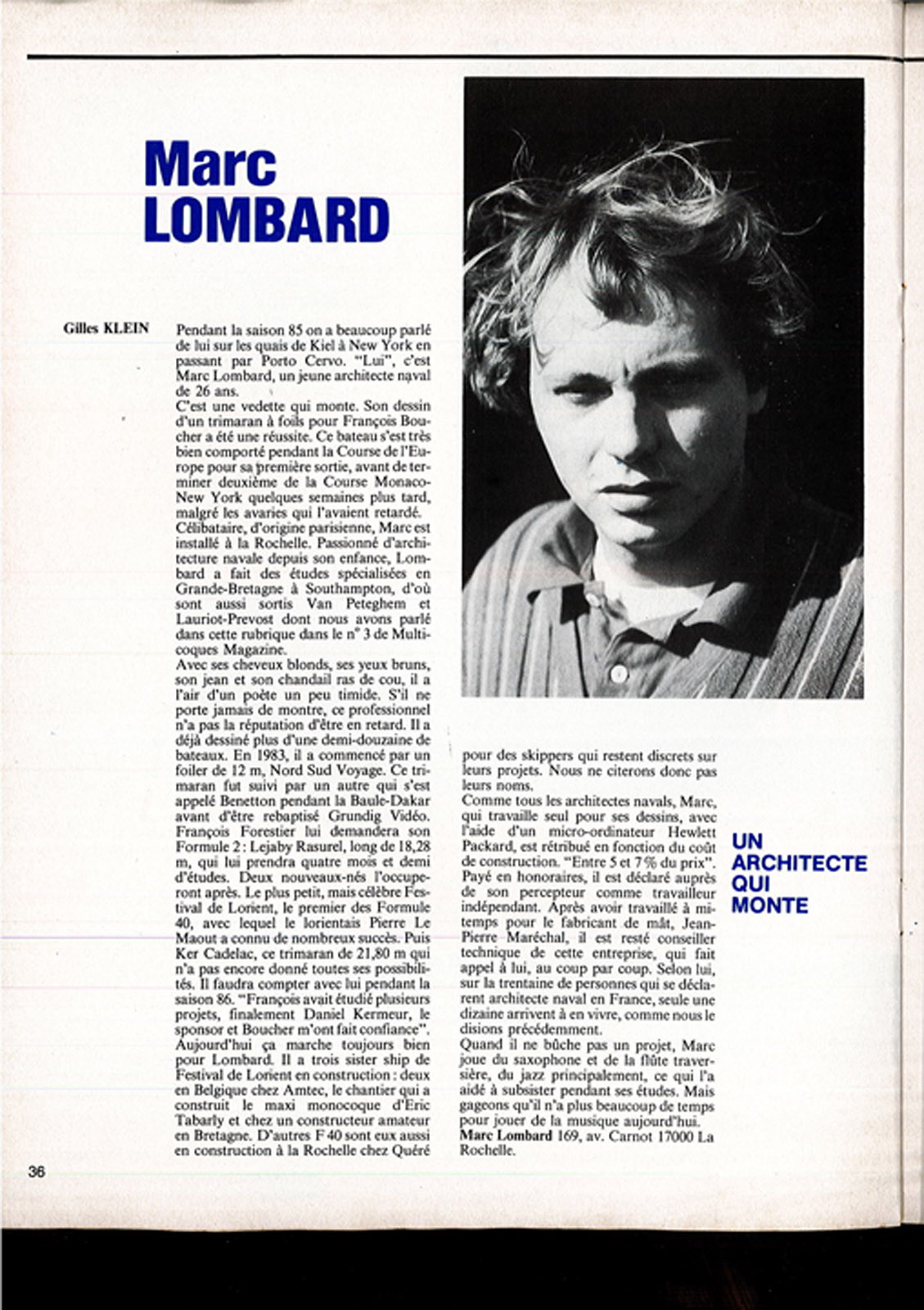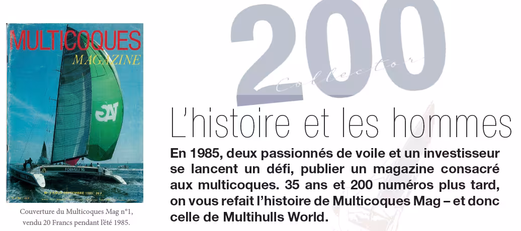 Eté 1984. Deux membres de l’Union Nationale des Multicoques rédigent le dernier bulletin de l’association. André Manchon est propriétaire d’un Tornado, et Gilles Abeloos d’un Victress 40 – plan Piver. Les voilà désœuvrés ou presque quand Gilles propose à André de monter une publication plus professionnelle, dans l’esprit du magazine anglais Multihulls International ou l’américain Multihulls. Le projet prend forme : un accord est trouvé avec l’UNM pour la reprise du titre Multicoques Magazine (Graham : on ne traduit pas ici), et le tandem est soutenu par un investisseur, Jean Gravel.