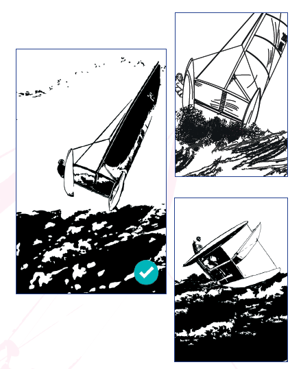 Une fois l’image choisie, j’ai sollicité Cyril Richard, un ami – barreur hors pair mais également graphiste – pour la dessiner et la vectoriser afin qu’ensuite Laurent Debacker puisse la travailler à loisir. Trois modifications par rapport à l’original : le barreur devient plus visible, la côte disparaît et de la « matière » est ajoutée afin qu’il soit possible de cadrer le catamaran où bon nous semble sur la couverture. Cyril a réalisé au final deux dessins : celui de la photo retenue et une composition proche. Chaque dessin a été proposé à deux niveaux de définition ; j’ai opté pour le premier, en version moins détaillée.