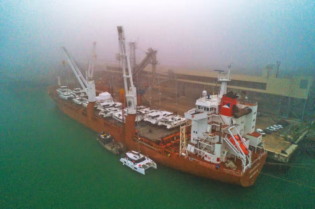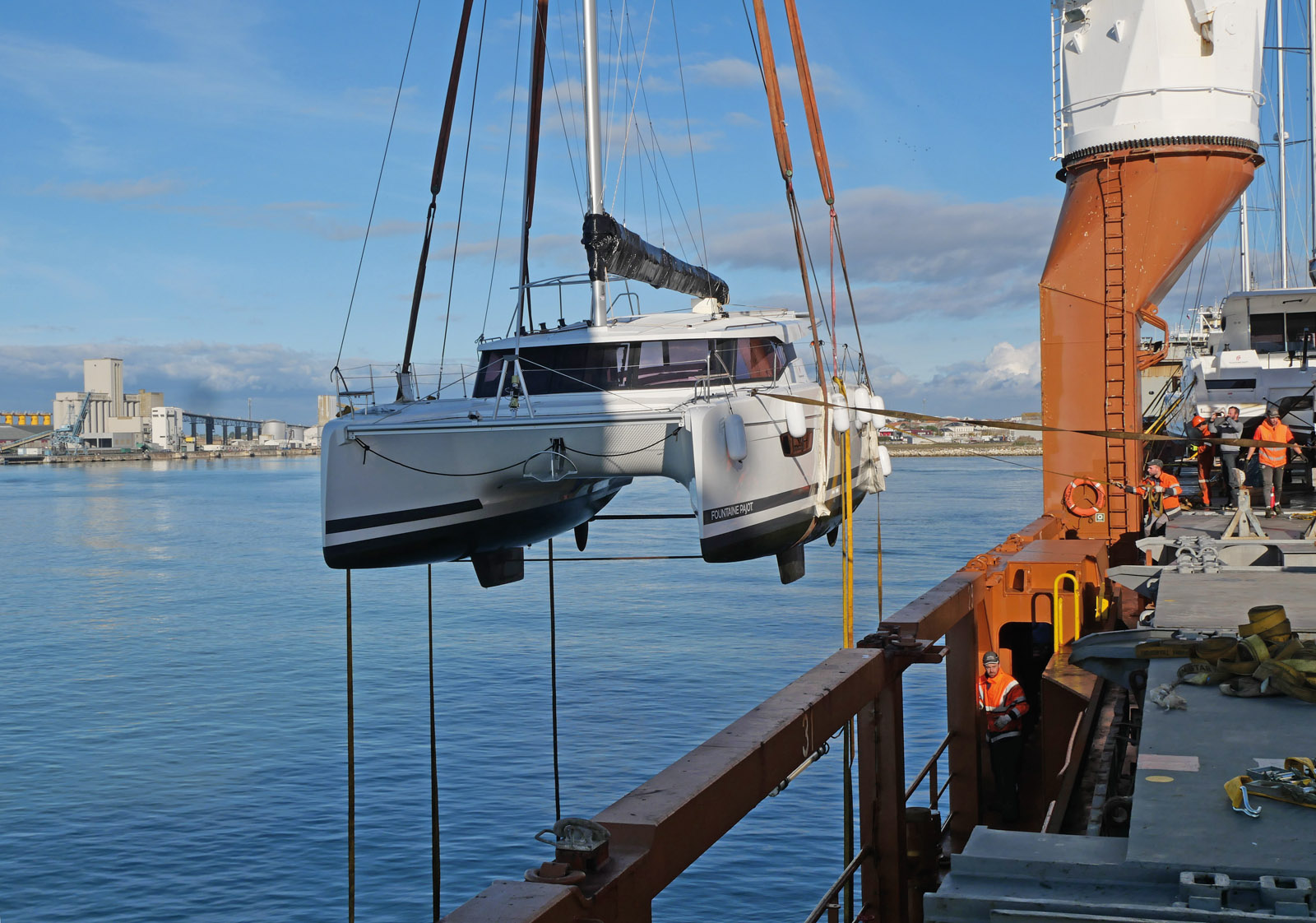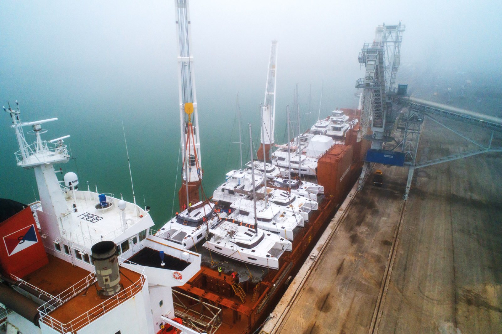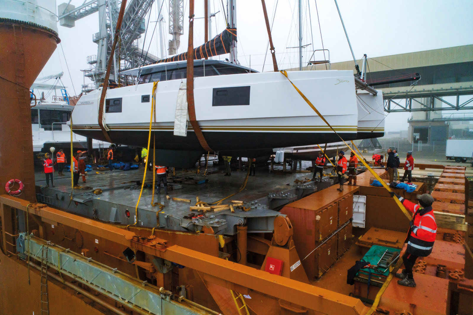 Rendez-vous a été pris au Port de Commerce de La Rochelle – La Pallice en octobre dernier. Côté ciel et température, l’ambiance est déjà hivernale. Mais sur les quais, l’activité ne faiblit pas. Nous sommes reçus sur le pont du MV Spuigracht. Cet imposant cargo battant pavillon néerlandais mesure 172 m de long pour 25,49 de large. Il fait partie de la flotte de Sevenstar Yacht Transport. Une poignée d’heures plus tard, le navire mettra le cap sur Palm Beach, en Floride. De là, certains bateaux seront transbordés en pontée d’un autre cargo, à destination de l’Australie et la Nouvelle-Calédonie… Pour l’heure, Elodie Le Blevenec et Matthieu Le Bihan, responsables de Sevenstar Yacht Transport France, s’affairent sur le deck du cargo, supervisant une armée de dockers, pilotes, plongeurs, techniciens et autres spécialistes du chargement. Ces derniers devront, dans les meilleurs délais, placer et caler à des emplacements bien précis une quinzaine de voiliers (en majorité des catamarans) et quelques bateaux à moteur sur le pont du cargo. Une rencontre dans le feu de l’action et un excellent moyen de découvrir l’univers du shipping, cette activité en plein développement.