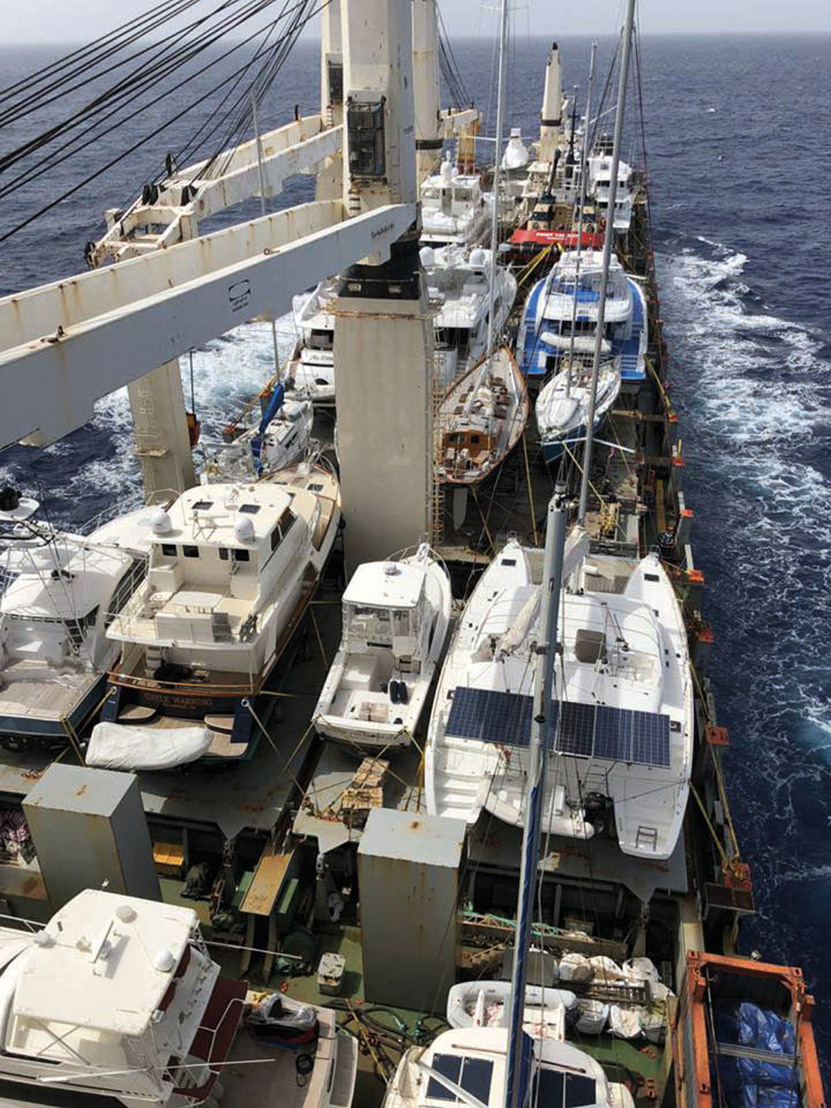 Elodie Le Blevenec et Matthieu Le Bihan (SYT) : Nous transportons avant tout les bateaux des chantiers et des professionnels du nautisme ; quelques particuliers font également appel à nos services. Au- jourd’hui, à bord de notre cargo, il y a deux voiliers de propriétaires sur la quinzaine d’unités que nous sommes en train de charger. Nous travaillons principalement avec des entreprises, mais nous étudions également toutes les demandes émanant de particuliers concernant le transport de leur unité. Au départ du hub de La Rochelle vers les Antilles, nous estimons que 80 % des bateaux que nous transportons proviennent de dealers ou brokers spécialistes du marché. Les particuliers qui nous contactent sont plus intéres- sés par des retours vers l’Europe de leurs voiliers depuis des destinations éloignées. Ils ont par exemple fait un demi-tour du monde, s’arrêtent en Polynésie, et souhaitent que leurs unités retournent dans leurs ports d’attache respectifs en Europe. Pour les transatlantiques, les particuliers ne font généralement pas appel à nos services.