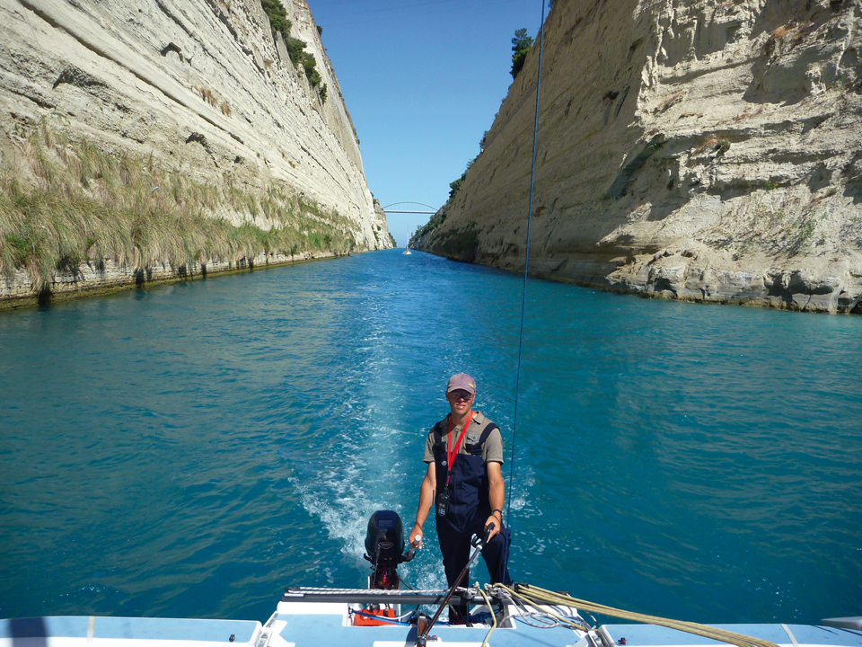 Après avoir expédié l'Italie du Sud qui ne nous a pas plu du tout, nous sommes arrivés début juin dans l'ouest de la Grèce. Mais l'objectif principal étant les Cyclades, nous avons donc poursuivi notre route via le golfe de Corinthe et son fameux canal. Là encore, il nous a fallu composer avec une météo plutôt féroce à l'intérieur du golfe, les 40 nœuds à 15h00 étaient notre lot quotidien et la mer ressemblait à une succession de murets de parpaings bien rapprochés. Heureusement que nous étions au portant dans cette pétaudière, car tirer des bords dans ces conditions n'aurait pas été viable. A l'escale, nous avons fait de superbes rencontres d'équipages qui eux aussi attendaient une accalmie pour reprendre le fil de leurs pérégrinations.