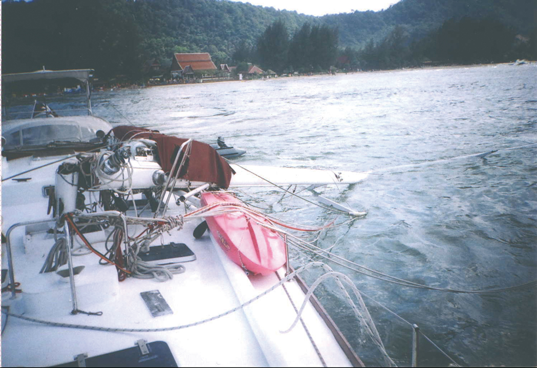 Au loin, on distingue nettement une série de déferlantes. Gérard, qui a déjà vécu des tsunamis, comprend immédiatement la situation. Il se retourne vers la plage et il se rend compte qu'elle fait maintenant 200 m de large au lieu des 100 m habituels (ce qui signifie que la mer a déjà baissé de 1 à 2,50 m). Il lui reste moins de 2 minutes avant que la première déferlante ne soit sur eux. Remonter le mouillage prend un peu plus de 5 minutes. Trop long… Immédiatement, Gérard ordonne que l'on passe l'annexe sur le côté afin qu'elle ne gêne pas les manœuvres et que son bout ne se prenne surtout pas dans une hélice. Mais un courant de jusant exceptionnel de 6 nœuds rend la manœuvre très difficile. Il faudra se mettre à quatre pour amarrer l'annexe sur le côté du bateau. Gérard met ensuite les moteurs en marche. La vague arrive par l'arrière… Avant l'impact, Gérard avance le bateau d'une dizaine de mètres. Puis marche arrière à 2000 tours/minute et tout le monde s'enferme dans le cata ! Cette première vague touchera la poutre arrière, pourtant située à 2 m au-dessus du niveau de l'eau. En quelques minutes, le cata subira l'assaut de six vagues successives : trois entre 1 et 2,50 m et trois vagues d'au moins 3,50 m. Après chaque vague, le bateau talonne violemment (il est pourtant mouillé dans 3,60 m d'eau…). Le cata touche à plat, mais il n'y a pas de craquements inquiétants. En revanche, le Swan n'aura pas cette chance : après une vague, il talonne violemment et se couche sur sa quille. La vague suivante lui arrachera son mât.