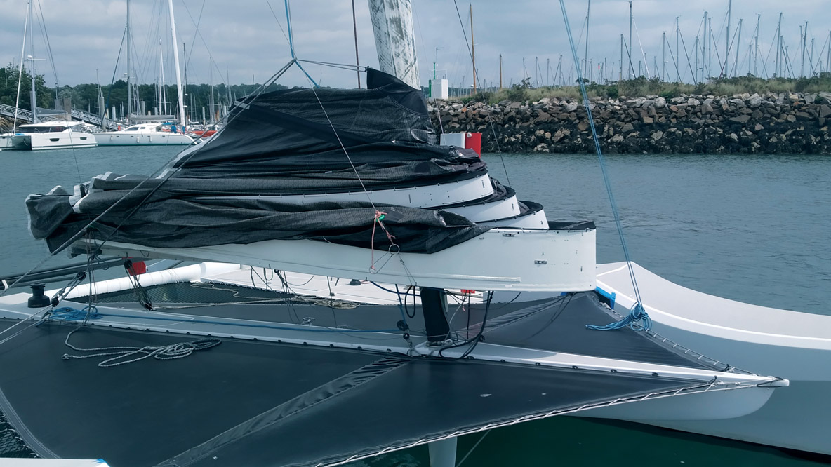 Le multicoque a subi quelques modifications, dont l’ajout de trampolines extérieurs. Les matériaux retenus sont le tissu carbone, la résine Sicomin Greenpoxy 33 et de la mousse Airex R63. Des solutions qui permettent à l’embarcation de ne peser qu’une tonne.
