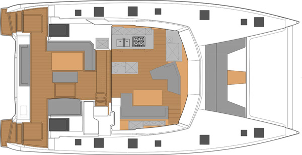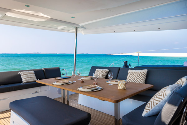Le pontage avant est occupé par un généreux solarium (7,6 m2) et deux vastes trampolines. La baille du guindeau est astucieusement coiffée par un capot en bois – lequel fait office de petite table. Les coffres ne manquent pas devant le mât, mais leur manipulation est entravée par la sellerie. Les deux pointes avant offrent un très grand volume ; elles peuvent être aménagées en couchette équipage. Quant aux passavants, ils sont toujours larges et parfaitement dégagés ; le niveau inférieur du cockpit se rattrape par trois marches aisées à franchir. Ce cockpit arrière est particulièrement accueillant, avec une grande table (205 x 99 cm) capable de réunir 10 convives, ses deux méridiennes latérales et sa belle banquette arrière de 2,28 m. On note la présence d’un capot qui donne sur le flybridge – il offre un peu d’aération parfois bienvenu et peut aider à la communication depuis le solarium. Plus à l’arrière, on retrouve une plancha à gaz, un logement pour le BIB, deux jupes arrière équipées et, entre les deux, une plate-forme hydraulique (200 kg max).