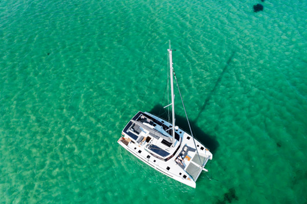 Si certaines marques du nautisme semblent hésitantes dans le domaine du design et de l’esprit de gamme, ce n’est assurément pas le cas du constructeur Fountaine Pajot ; à l’instar des grands fabricants d’automobiles, le chantier rochelais est parvenu à signer tous ses catamarans de la même griffe ; c’était déjà le cas avec les précédentes générations Joubert/Nivelt. L’esprit de famille est mis en place de nouveau avec la signature du premier Berret Racoupeau Yacht Design de « petite » taille – c’était l’Hélia 44 en 2012. La génération actuelle, avec ses étraves inversées, a été étrennée par le Saona 47 en 2017 (devenu Tanna en 2021) et rapidement confortée par l’Astréa 42 et l’Alegria 67 en 2018, l’Elba 45 en 2019 et enfin le Samana 59 en 2020. L’Aura 51 reprend très exactement les mêmes codes – très réussis d’ailleurs. On retrouve donc des superstructures allégées grâce au bouge de pont prononcé, le rouf à casquette qui s’avance à peine devant le pied de mât et le bimini affiné au maximum recouvrant pratiquement tout le cockpit. La seule évolution notable de cette dernière génération est la pente des étraves, désormais inversée.