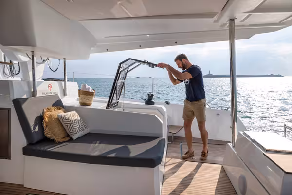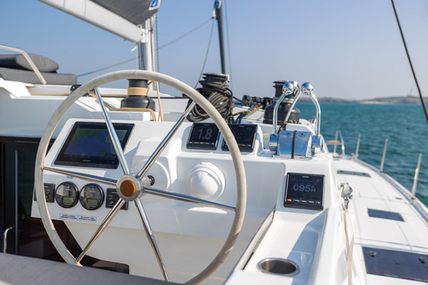 Poste de manoeuvre devant, poste de barre derrière – la traditionnelle helm station tout-en-un se dédouble à bord de la plupart des catamarans Fountaine Pajot.