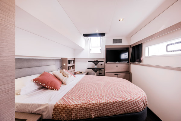 Notre Aura 51 dispose de 5 cabines (2 à bâbord, 3 à tribord) ; il est possible d’en avoir 4 avec la séduisante déclinaison Full Maestro, qui réserve toute la coque bâbord au Propriétaire, ou encore 6. Toutes présentent des lits installés travers à la marche (largeur de 1,50 ou 1,60 m) et sont équipées d’un cabinet de toilette. Les deux cabines les plus à l’arrière offrent un accès dans le cockpit. Dans les coques, la hauteur sous barrot est partout supérieure à 2 m.