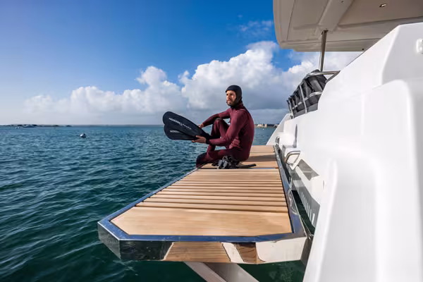 La plate-forme arrière peut supporter une annexe de 200 kg ; au mouillage, elle fait office de beach club.