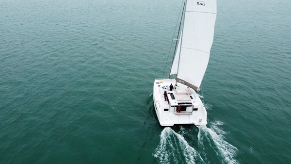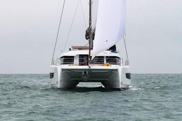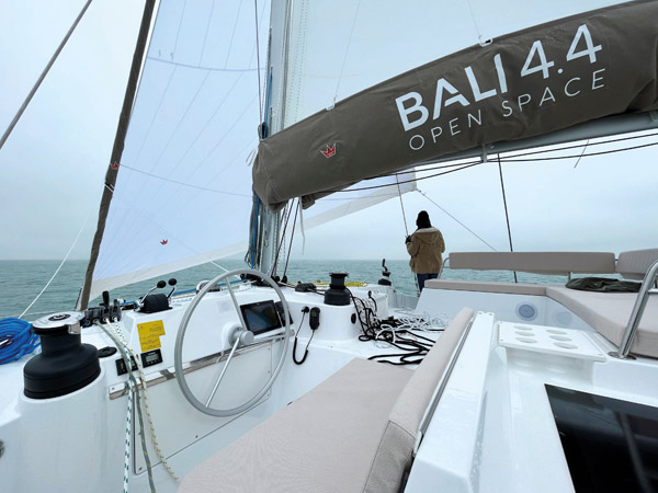 Sitôt la grand-voile envoyée et le Code 0 déroulé, on affine les réglages du traveller et des écoutes. Avec un vent oscillant entre 8 et 15 noeuds, la vitesse vent de travers se cale entre 7 et 8 noeuds, avec quelques pointes à 9 au gré des risées. Quand la grande voile d’avant est pile poil réglée avec tous ses penons qui flottent bien horizontalement, on sent clairement que le Bali 4.4 ne demande qu’à marcher. La barre, sans être particulièrement agréable, est plutôt douce et directe. Quelques détails restent à régler en ce qui concerne le circuit des écoutes de Code 0 – les bouts sont sujets à divers frottements sur leur course. Lors de l’empannage, l’écoute à reprendre s’entrave sous l’angle du rouf. Sur ce coup-là, Boris me glisse que, d’ordinaire, on roule et on déroule… OK ! Le Code 0 défendu par le constructeur apporte un évident bonus jusqu’à 70° du vent environ. On ne peut pas remonter plus, car les points de tire passent logiquement à l’extérieur des haubans. Pour gagner plus au vent, on roule donc le Code 0 pour dérouler le solent autovireur. La surface de la voile d’avant passe de 74 à 42 m2 ; malgré un ratio voilure/poids de 8,68 m2/t, plus favorable que les 7,07 du Bali 4.2, la différence de punch se fait sentir quand on se contente de l’autovireur. Si on parvient à caper à 50/55° du vent réel, la vitesse peine à dépasser les 5 noeuds, la dérive est sensible et le réglage de la voile est assez pointu. Nous ne sommes clairement pas dans les conditions idéales d’un catamaran de croisière confortable pour naviguer à 100 % à la voile – les moteurs (ou un des deux) sont là pour appuyer la route, sans complexe.