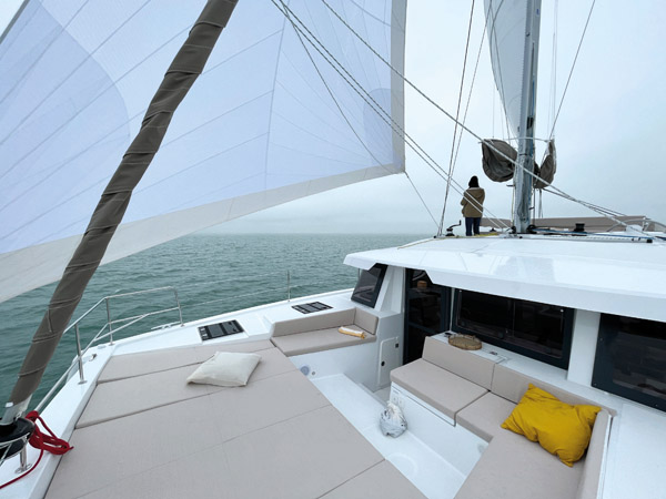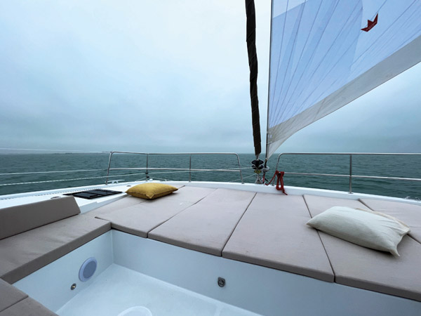 Sitôt le gennaker déroulé, c’est le turbo assuré pour cette plate-forme pourtant prévue avant tout pour le confort.