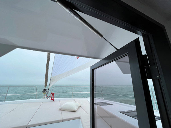 La porte avant simplifie considérablement la circulation à bord. L’ensemble devra être un peu plus rigide et le vérin plus costaud pour affronter sans broncher un vent fort.