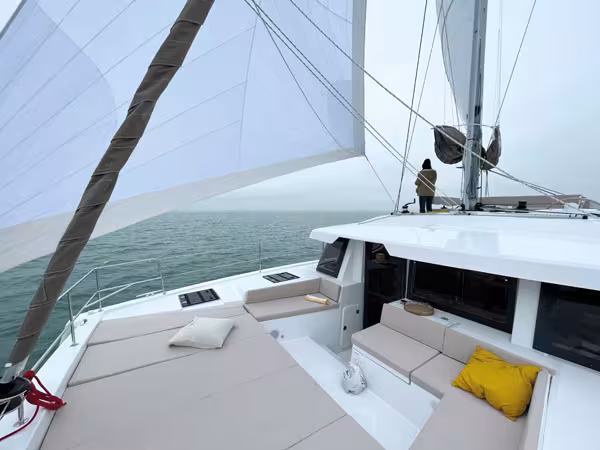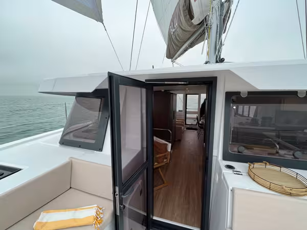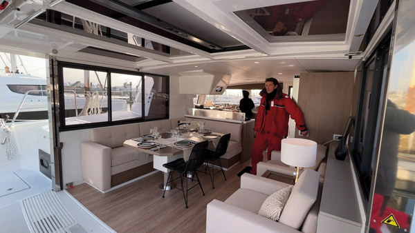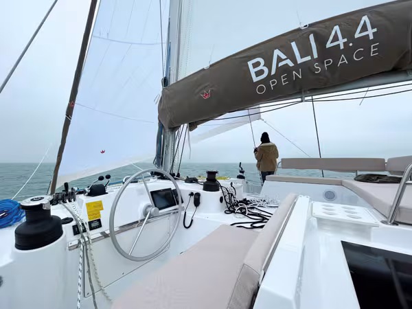 Nous avons pu essayer ce Bali en avant-première et… très tôt dans la saison, ce qui ne nous a pas du tout empêchés de profiter de l’esprit hédoniste défendu par les concepteurs de ce catamaran décomplexé. Ce n’était pourtant pas gagné : brume tenace, température négative et surtout bouts raidis par le gel n’invitaient pas à la navigation ! A quai, Boris Compagnon, directeur commercial de Catana Group, et Kahina Oussadi, du service Communication, ne se sont pas laissé abattre : ils ont déniché quelques chauffages d’appoint branchés sur le secteur – lesquels nous offrent quelques degrés de plus bienvenus à l’intérieur. Evidemment, pour l’heure, pas question de profiter du mode open space défendu par tous les modèles Bali ; nous revendiquons plutôt de tout fermer ! Force est de constater que cette configuration « hivernale » est finalement très convaincante également – la surface XXL de la nacelle et les très grandes ouvertures s’avèrent très agréables.