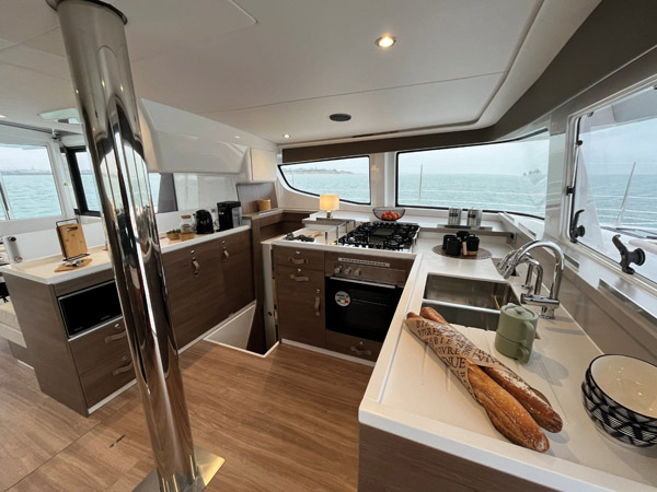 La cuisine forme pratiquement un U – juste coupé par la descente vers la coque bâbord.