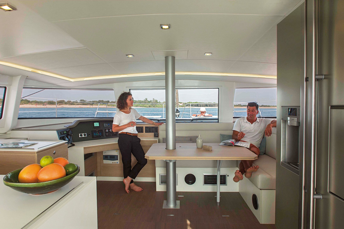 Le pont présente des passavants larges, un cockpit arrière qu’on peut qualifier de conventionnel : les assises se répartissent à bâbord avec une grande banquette en L autour de la table – 1,58 m par 0,93 m. Il suffit de disposer deux tabourets pour réunir six ou sept personnes. Côté tribord, sous le poste de pilotage, une méridienne permet de lire ou de se reposer, parfaitement protégé du soleil ou des intempéries grâce au bimini rigide très couvrant. La plate-forme arrière est plus originale : elle fait office de garde-fou en navigation, et de plongeoir au mouillage. A l’avant, les traditionnels trampolines ont été remplacés par un cockpit en dur avec deux tables, solarium et bastingage inox. Bien calé contre le rouf, même au près, on ne sent plus le vent. The place to be !