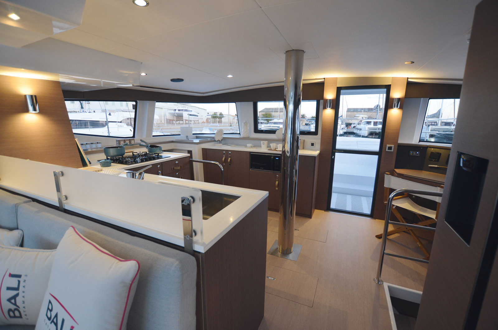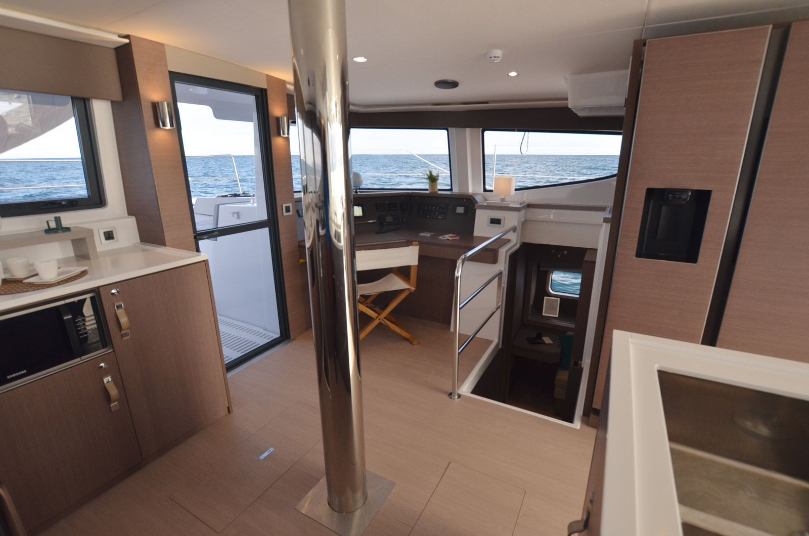 L’espace de dégagement au centre du catamaran est très grand car dépourvu de table. Il accueille une cuisine XXL, une table à cartes et un frigo américain énorme.