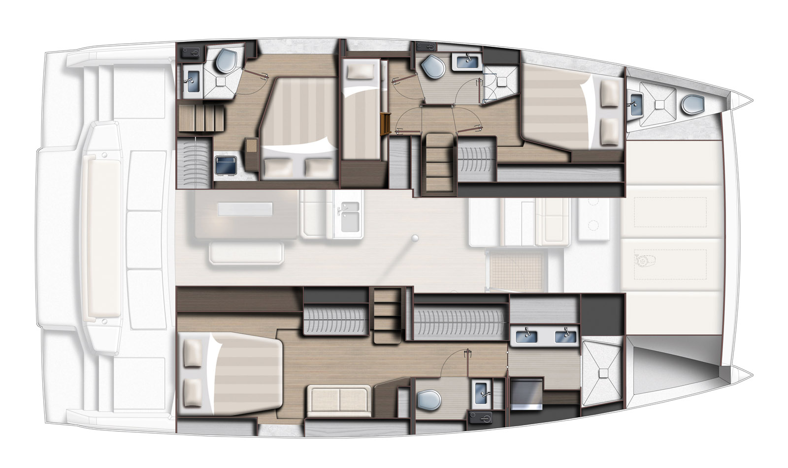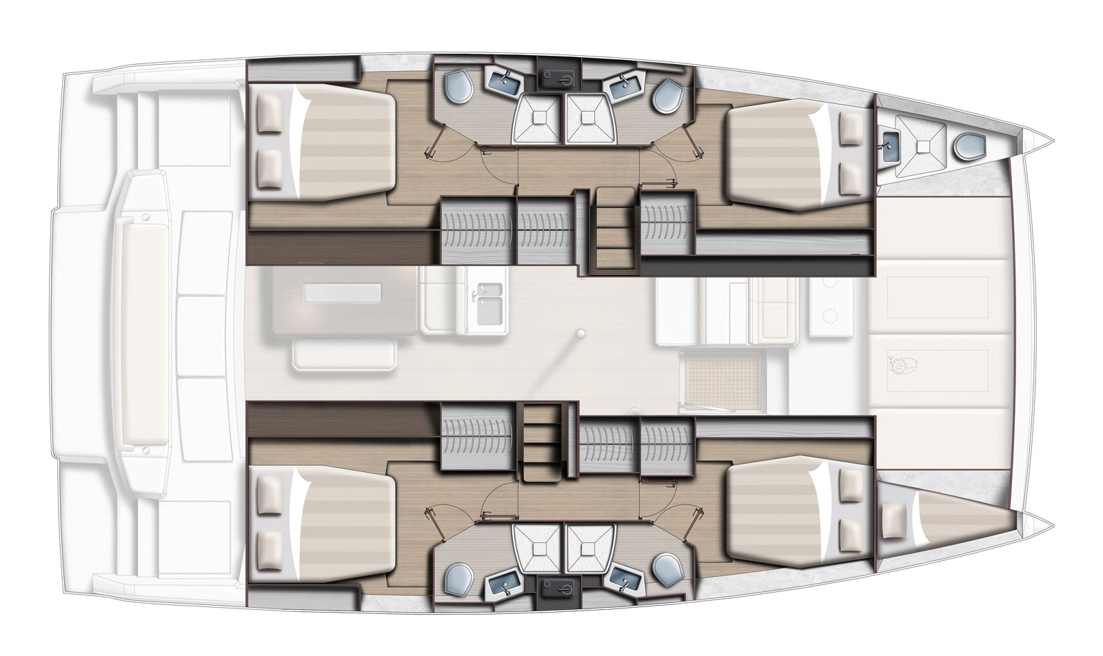 Le 4.6 a donc un double challenge à relever : faire mieux que son prédécesseur le 4.5 et que la rude concurrence dans cette taille. Heureusement pour lui, entre-temps, le 5.4 puis le 4.8 ont apporté leur lot de nouveautés, certes intronisées par des modèles plus grands, mais adaptables dans ce segment des 14 mètres. Le flybridge avec bain de soleil et mini salon tout comme la porte donnant accès sur le cockpit avant depuis le carré semblent devenir incontournables pour passer de bonnes vacances sur l’eau – ces deux caractéristiques ont donc fait leur apparition sur ces modèles. Le 4.6 que nous découvrons au chantier de Canet en novembre dernier prétend compiler toutes ces améliorations ergonomiques. Au premier abord, la similitude avec le 4.8 nous interroge sur le positionnement. Boris Compagnon, le directeur des ventes, nous explique les enjeux de cette longueur clé de 46 pieds – le cœur du marché aujourd’hui – et de l’effort quant à l’accessibilité réalisé par le constructeur. Boris précise que six cabines et autant de salles de bains, avec des lits king size dans le sens perpendiculaire, ne sont possibles qu’avec ces deux pieds en moins – pas trois, et encore moins quatre. Les aménagements de notre 4.6, le prototype de la série, comprennent quatre cabines. La cabine Propriétaire occupe tout le flotteur tribord avec une suite dressing-toilette menant à la salle de bains avant et une partie lounge-bureau et lit vers l’arrière. Cette cabine est immense et on lui reprochera juste un petit manque de clarté, nous y reviendrons. Le flotteur bâbord, quant à lui, est pourvu de trois cabines. La plus grande est indépendante, avec un accès depuis le cockpit arrière. Les deux autres, en bas de la descente du carré, se partagent une salle de bains commune. Celle du milieu est équipée de lits Pullman dans le sens perpendiculaire et l’articulation avec la cabine double avant est parfaite pour une famille. Les différentes versions voient le nombre varier de trois à cinq cabines avec au maximum quatre salles d’eau. L’ensemble des aménagements, avec de petites niches bibliothèque et des stores, est très cosy. Les pics avant indépendants peuvent être aménagés avec une cabine et/ou toilettes au besoin. Le morceau de choix reste cet espace de vie ouvert sur le pont principal qui compose une suite en enfilade. Deux tables - une dans le cockpit avant et une très grande, dans la partie arrière sous le fly - encadrent une très grande cuisine qui sert de dégagement pour les cabines et de coin navigation. Un centre névralgique dans lequel on circule aisément, tout comme sur l’ensemble du pont principal de plain-pied, sans seuil ni marche. En tout, une centaine de mètres carrés sont utilisables, un record pour la catégorie.