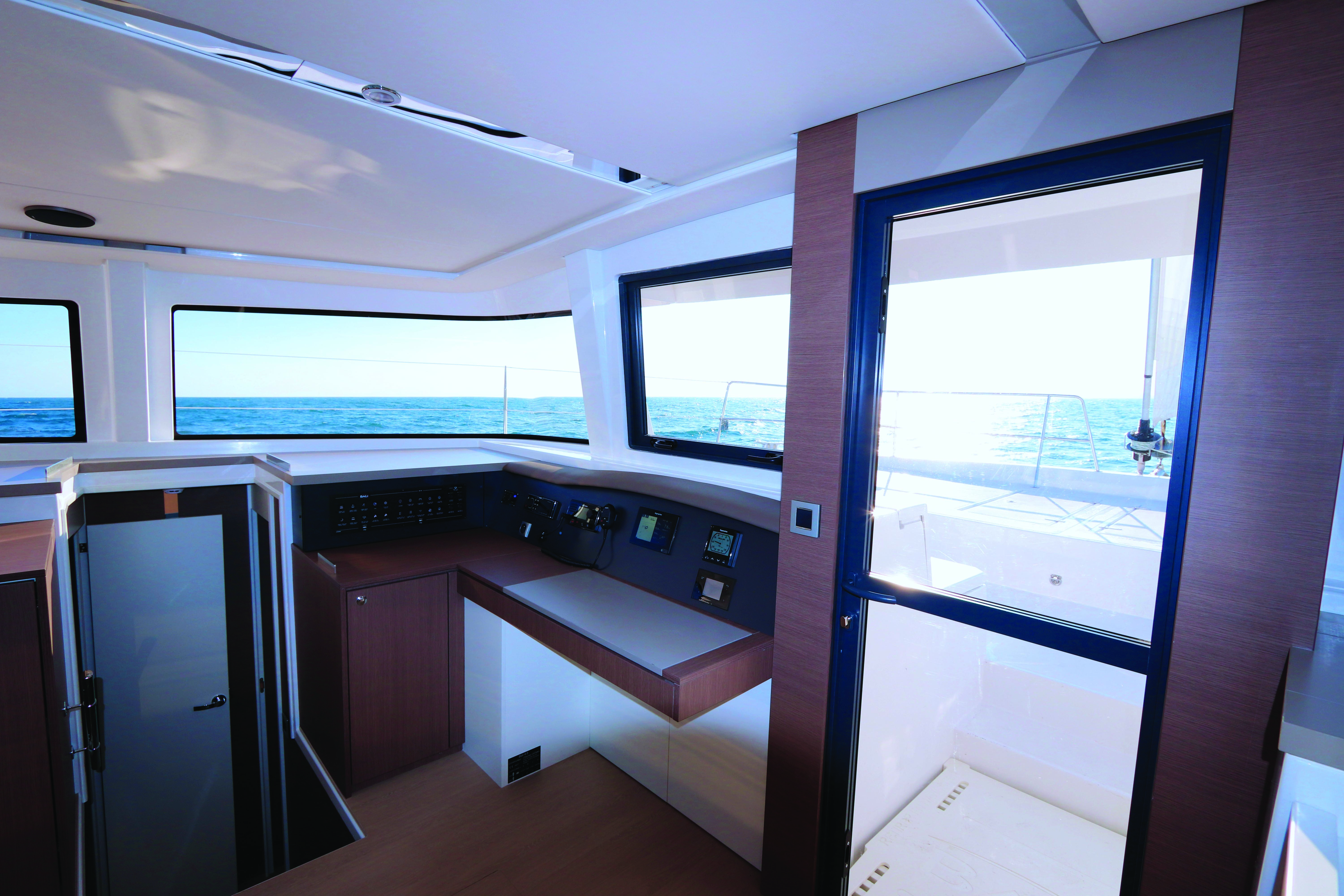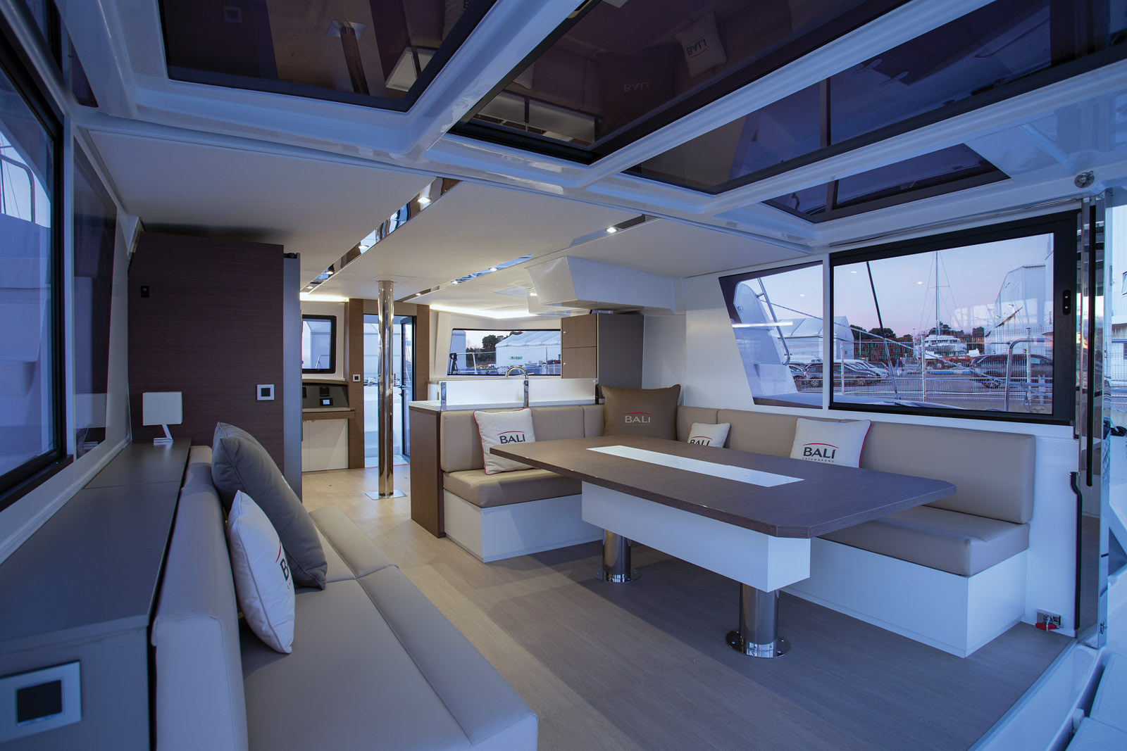 Est-ce que cette promesse économique se double de séduisantes qualités nautiques ? C’est en tout début d’hiver que nous avons eu l’occasion de tester sur l’eau celui que le chantier présente (déjà) comme le premier Bali de deuxième génération. Ce qui le distingue de ses prédécesseurs, en dehors de sa taille, bien évidemment, c’est tout d’abord une évolution dans le style extérieur. Celui-ci gagne en fluidité, dans la lignée du Bali Catspace dévoilé presque simultanément. C’est l’accumulation de petits détails dans le design : là un angle coupé qui rend les immenses volumes un peu moins massifs, ici des inserts sombres plus grands rendant les très grands hublots un peu moins voyants, l’ensemble plus agréable à l’œil… Catamaran stationné parallèlement au ponton, l’accès à bord est aisé via la jupe arrière qui se prolonge au-delà de l’imposant bordé. La hauteur, et donc le fardage, restent pourtant assez impressionnants. La présence d’un vrai flybridge accessible depuis les deux passavants, avec poste de barre à tribord, assise et table pouvant se transformer en un immense bain de soleil, n’y est sans doute pas pour rien, alors que l’on ne fait face qu’à un « petit » 15 mètres, 14,28 m de longueur de coque exactement. Pourtant, outre ce flybridge, pour plagier un célèbre constructeur automobile, ce Bali 4.8 a tout d’un grand. Ou plutôt beaucoup de son grand-frère, le 5.4 ? Avec pour commencer une remarquable porte oscillo-battante de 3 mètres de large à l’arrière qui, complétée de vitrages coulissant sur les côtés, transforme le carré en cockpit, et vice versa, en moins de temps qu’il n’en faut pour l’écrire. Et nous devons avouer que, lorsque la brise fraîchit, que le soleil descend très vite en ce mois de janvier, il est vraiment séduisant de retrouver, une fois l’ensemble refermé en quelques secondes, un intérieur cosy. D’un coup, tout y est plus feutré, protégé du vent, du froid, et même d’une grande partie des bruits extérieurs. Qui plus est, l’espace y reste vraiment impressionnant, même diminué du mètre d’extérieur qui relie les deux jupes arrière ou les deux cales moteur, selon que l’on est hédoniste ou motoriste.