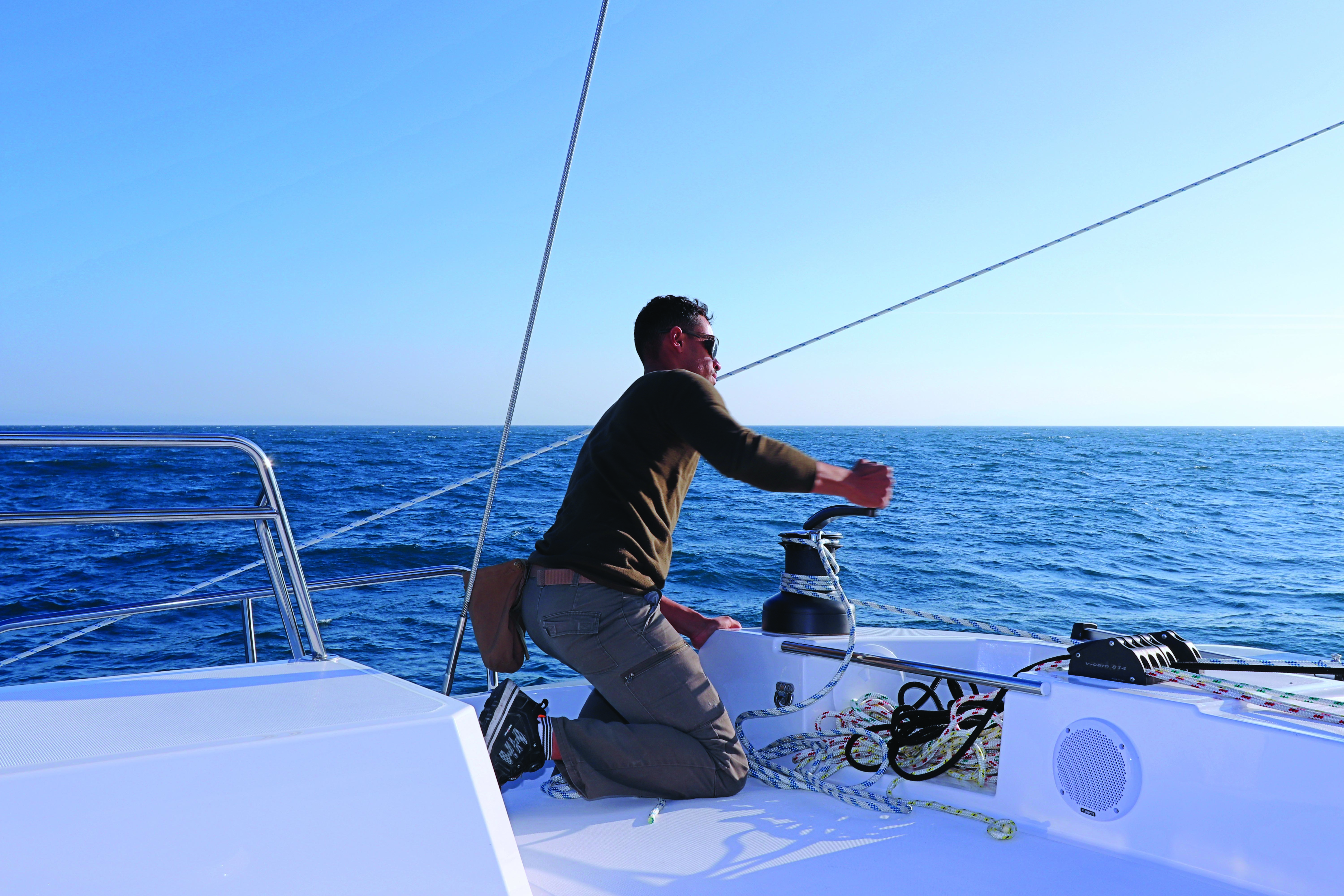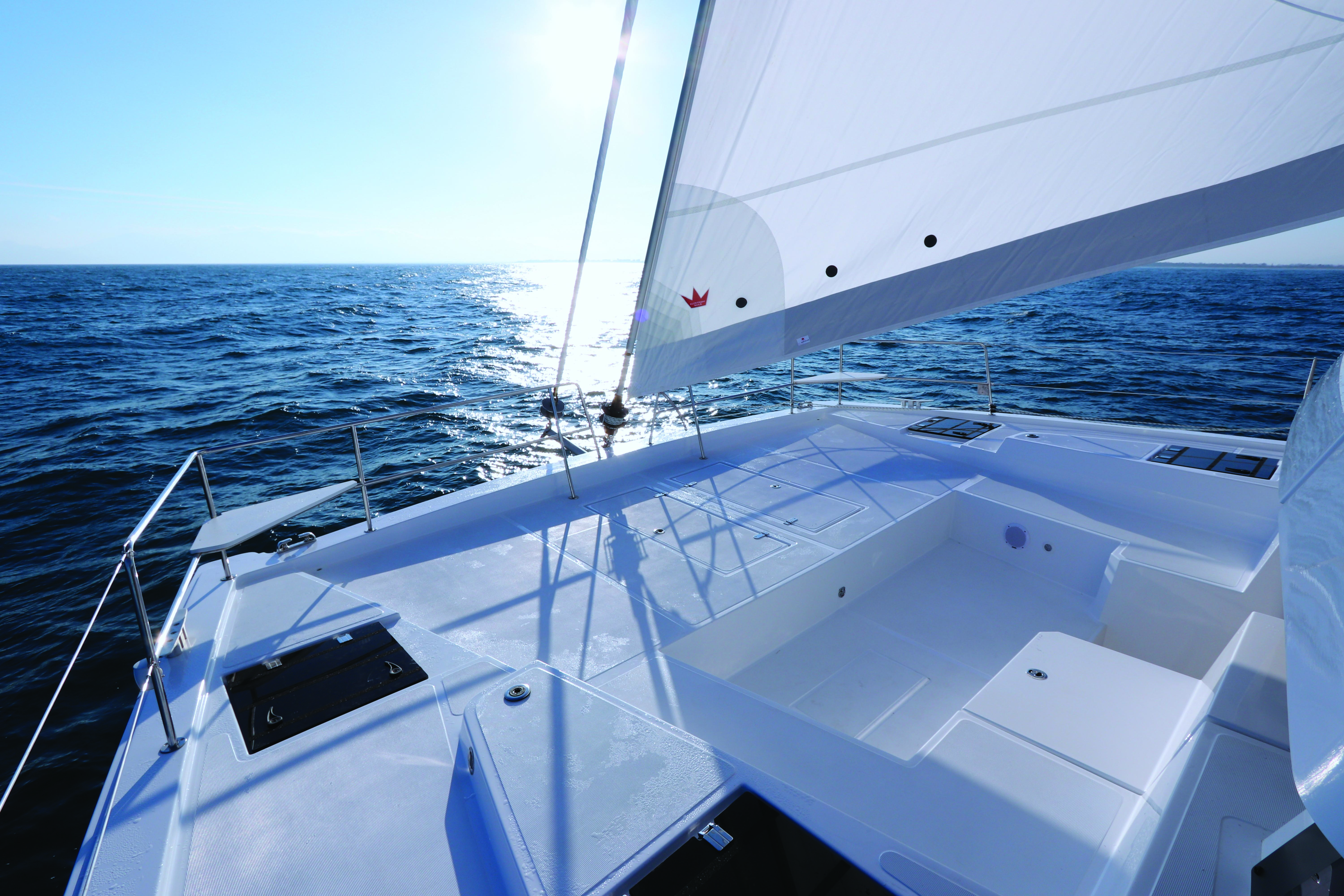 L’autre caractéristique empruntée au grand frère 5.4, c’est la porte frontale. Légèrement décalée sur tribord, elle donne accès au pont avant. Le terme « pont » est utilisé à dessein, car celui de « cockpit avant » serait sans doute trop restrictif. En effet, ce bel espace de près de 15 m2 propose deux banquettes en L qui entourent une table sur sa partie arrière, et un bain de soleil avant occupant toute la largeur entre les deux coques, jusqu’aux étraves. C’est l’avantage de cette partie entièrement rigide par laquelle Bali a osé remplacer le traditionnel trampoline. Initialement perçue comme une hérésie par tout amateur de multicoques – moi le premier – ayant vécu quelque enfournement, deux caractéristiques viennent bousculer nos a priori. Tout d’abord, depuis le bord de la vedette dédiée aux photographes, au moment où le Bali affronte de face et au moteur la houle caractéristique de la sortie du port de Canet-en-Roussillon, je m’aperçois que la poutre composite avant est particulièrement haute et que la forme de la nacelle descend très progressivement vers le pied de mât. Enfin, si on veut vraiment imaginer le pire, alors qu’un filet ne freine en rien l’enfournement, la plate-forme rigide agit « comme une spatule de ski dans la poudreuse », dirait Philippe Echelle, notre essayeur en chef. Cette dynamique favorise donc la sortie des étraves d’une vague plus importante que les autres. Si les étraves sont hautes, le poste de barre au flybridge l’est tout autant. L’avantage est que les quatre extrémités du catamaran sont à portée de vue, mais, revers de la médaille, on s’y sent un peu isolé lors des manœuvres de port. Il faudra compter sur une bonne paire d’équipiers pour passer les amarres à terre. En revanche, à portée de main du pied de mât, toutes les manœuvres sont accessibles, même si les winches sont un peu bas à mon goût. A l’inverse, inconvénient inhérent à la formule flybridge, la bôme est perchée très haut. A 8 nœuds au moteur à 2400 tours par minute, le Bali 4.8 s’est vite dégagé de la côte pour trouver une petite brise de sud d’une douzaine de nœuds, une fois dépassé l’axe du cap Béar. Alors que sous solent autovireur le bateau peine à dépasser les 6,5 nœuds, doubler la surface du triangle avant en déroulant le Code 0 (90 m² contre 47 m²) donne immédiatement vie au Bali 4.8. Sans prétendre qu’il soit né pour la performance, son comportement est plus agréable qu’attendu. Croiser à 8,5 nœuds, à 95 degrés d’un vent soufflant à un petit 13 nœuds, n’a rien de déshonorant à nos yeux pour un programme purement croisière, voire charter.