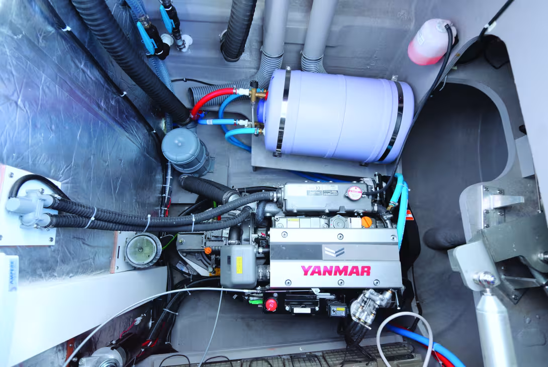 Une fois à l’intérieur, imaginez un ensemble carré-cuisine-table à cartes d’un bon 27 m² entièrement de plain-pied, et dans lequel la lumière rentre par des hublots à quasiment 360 degrés. Comme la table (220 x 116 cm) et les assises (6,50 m de longueur cumulée) sont à la fois celles du cockpit et celles du carré, les dimensions sont plus que généreuses. L’ensemble réfrigérateur/congélateur trouve intelligemment sa place entre carré et cuisine, aisément accessible depuis ces deux zones de vie privilégiées. Avec sa double porte de 1,60 m de haut, il paraît immense, mais il ne faudra pas moins avec 12 équipiers à bord. La cuisine elle non plus ne manque pas d’espace, avec 2,60 m de plan de travail tout de Corian revêtu. Les rangements n’ont pas été oubliés, que ce soit en hauteur (où un micro-ondes peut aussi s’intégrer), en dessous avec un astucieux compartiment dédié au tri des déchets, mais également sur bâbord, et enfin vers l’avant en vis-à-vis de la table à cartes. Celle-ci bénéficie d’une belle surface, a la bonne idée d’être tournée vers l’avant et d’offrir une vue panoramique imprenable. C’est à la fois plaisant quand la mer se fait idyllique, et rassurant car on conserve un contrôle visuel constant sur la côte, les bouées, et les autres bateaux.