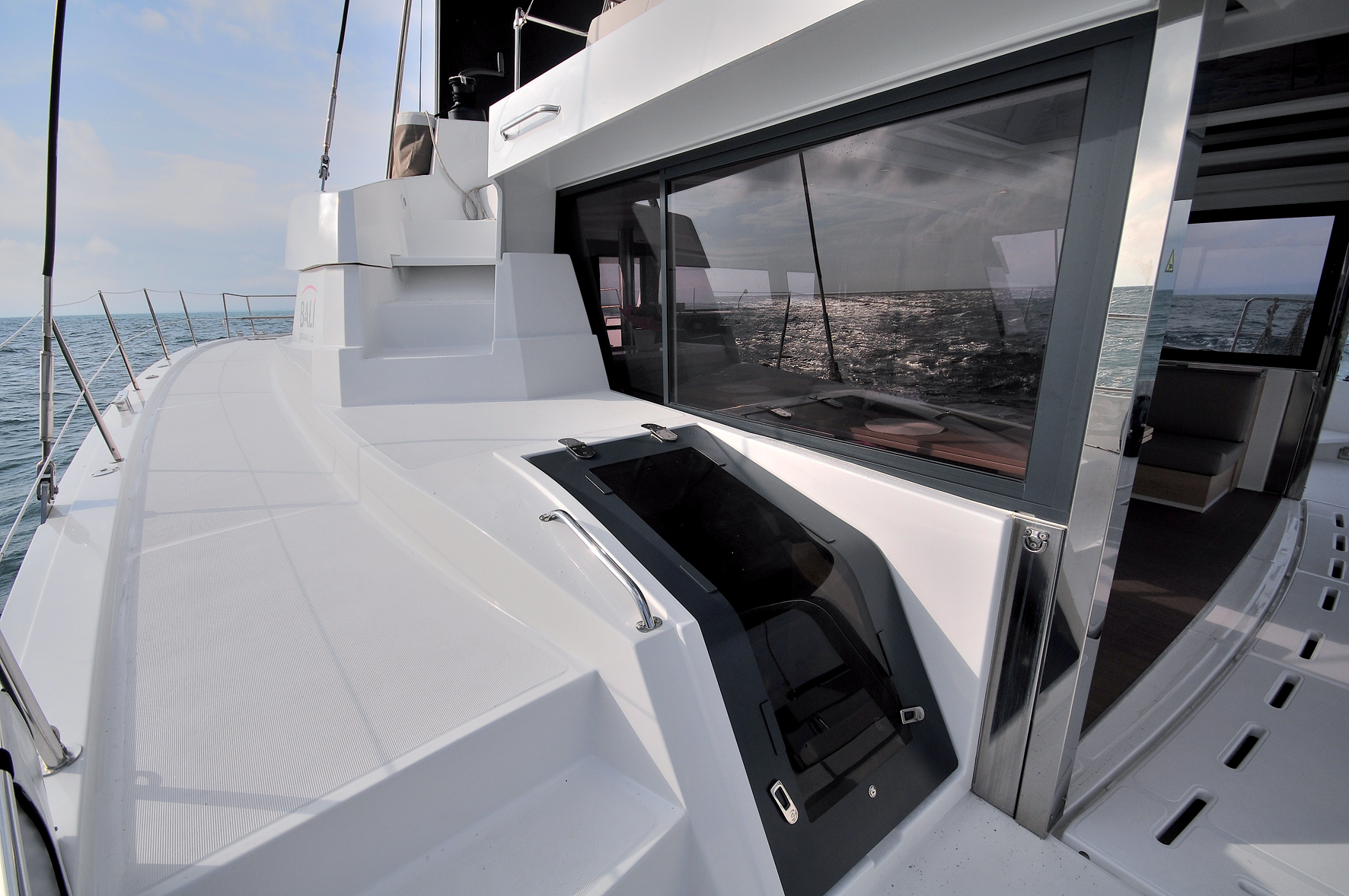 Incontestablement, le concept apporté par les premiers Bali est maintenant validé. Exigence du cahier des charges et esprit d’innovation, le 5.4 est bien un Bali ! Pour encore plus de convivialité et de fluidité dans les circulations, nous avons décidé de proposer un passage direct entre le carré et le cockpit avant. D’un point de vue architectural, un des gros points forts des Bali réside dans la raideur de leur plate-forme. Au-delà des avantages évidents en termes de confort, c’est l’adoption du pontage avant qui permet une disposition structurelle inédite et très favorable. Cette raideur structurelle est - pour la vie des bateaux - un atout pour leur vivacité et leur comportement, elle est aussi une garantie de bonne tenue et de longévité pour l’ensemble des composants, du gréement aux aménagements.