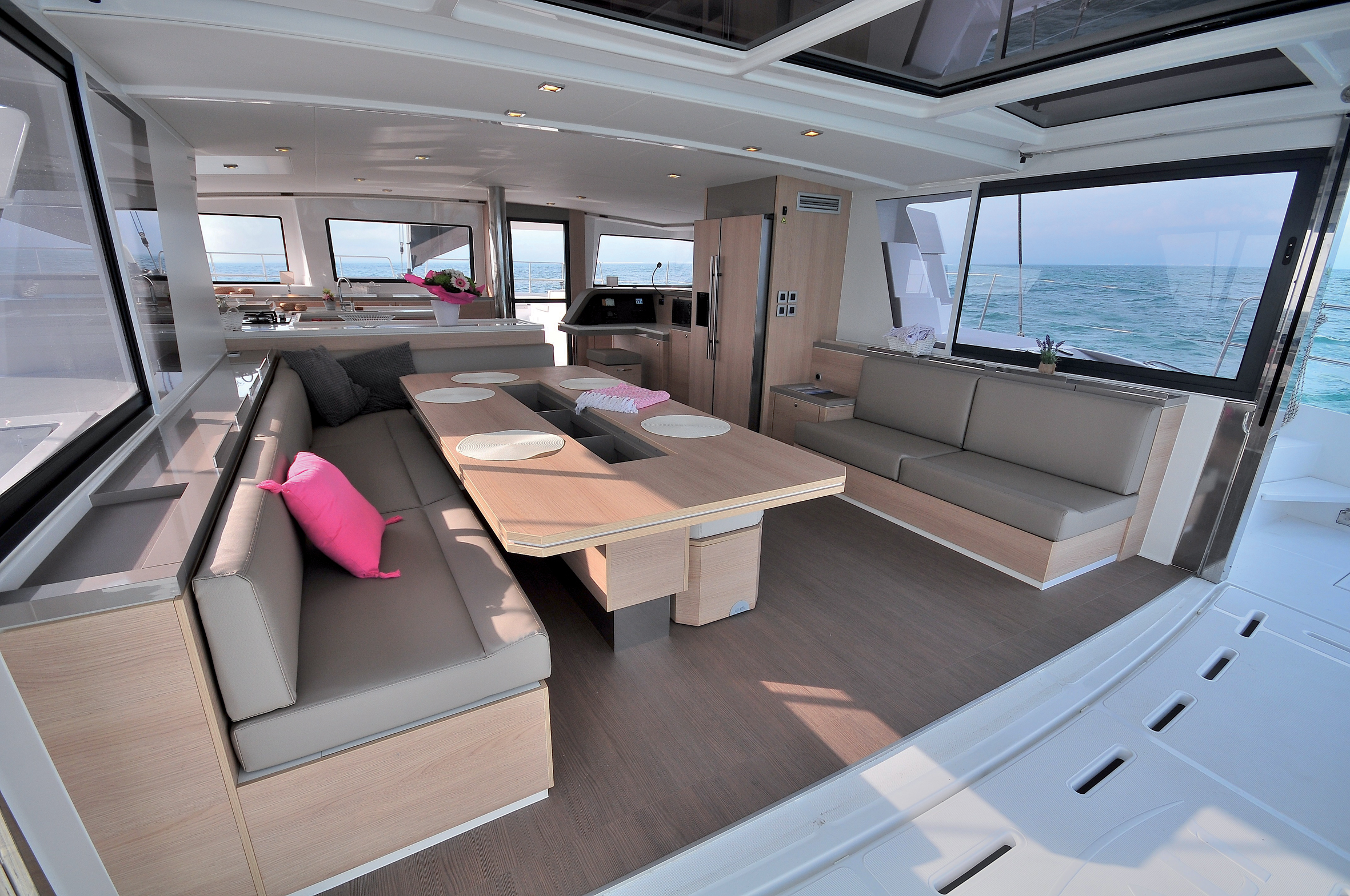 Il fut un temps ou l’on imaginait les multicoques comme des voitures de sport, on ne demandait pas aux futurs "pilotes" d’enfiler combinaison, casque et lunettes d’aviateur, mais l’esprit y était ! Parler aménagements était presque sacrilège ! Cela faisait partie du charme de cette culture montante ! En profitant de l’aubaine que constitue la géométrie du catamaran, on découvrit ensuite les "familiales", les "limousines", puis les "SUV" qui assumaient d’autant mieux leur embonpoint que cela se passait sous les applaudissements d’équipières voyant là une belle revanche contre les cirés jaunes et leur vision dégoulinante d’un nautisme à poils durs dont elles ne voulaient plus ! Curieux de constater comme les segments du nautisme et de l’automobile peuvent connaître des destins croisés ! Bruit, fureur et sensations fortes semblent passés de mode ! Entre cette évolution "bourgeoise" et la frange marginale d’équilibristes qui défrichent le vol à grande vitesse, s’épanouit encore une multi-plaisance romantique, chevelue, parfois désargentée qui se fabrique toujours des bateaux en Espagne et revendique une sensibilité moitessiérienne sympathique proche des visions de James Wharram ou Dick Newick. La philosophie du Bali 5.4 se situe à l’opposé de ces enthousiasmes "primitifs", et propose aux amateurs du 21e siècle un "sea life style" douillet, rassurant, confortable, presque casanier, mais sacrément séduisant. Bref, en rupture avec les attributs identitaires de la navigation de plaisance : froid pénétrant ou chaleur excessive, humidité, inconfort et promiscuité… certains esprits chagrins regrettent ; la plupart (surtout les nouveaux venus) apprécient ! En arrivant sur le Bali 5.4, on franchit distinctement la ligne de démarcation entre ces deux mondes pour pénétrer à bord d’un catamaran qui anticipe un nouvel usage : celui d’une plaisance partagée, familiale ou tribale et dilettante qui se donne les moyens de séduire les récalcitrants.
