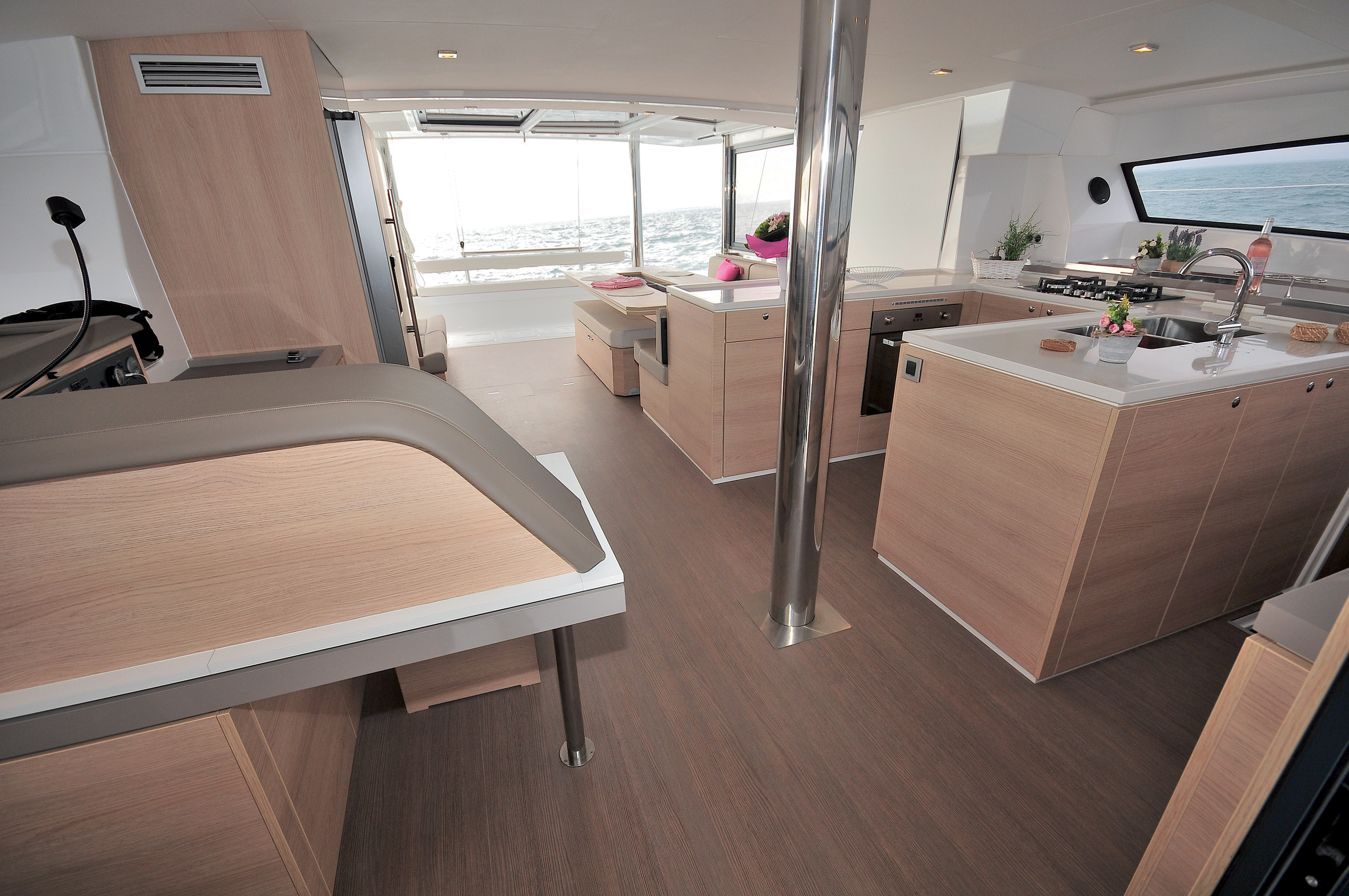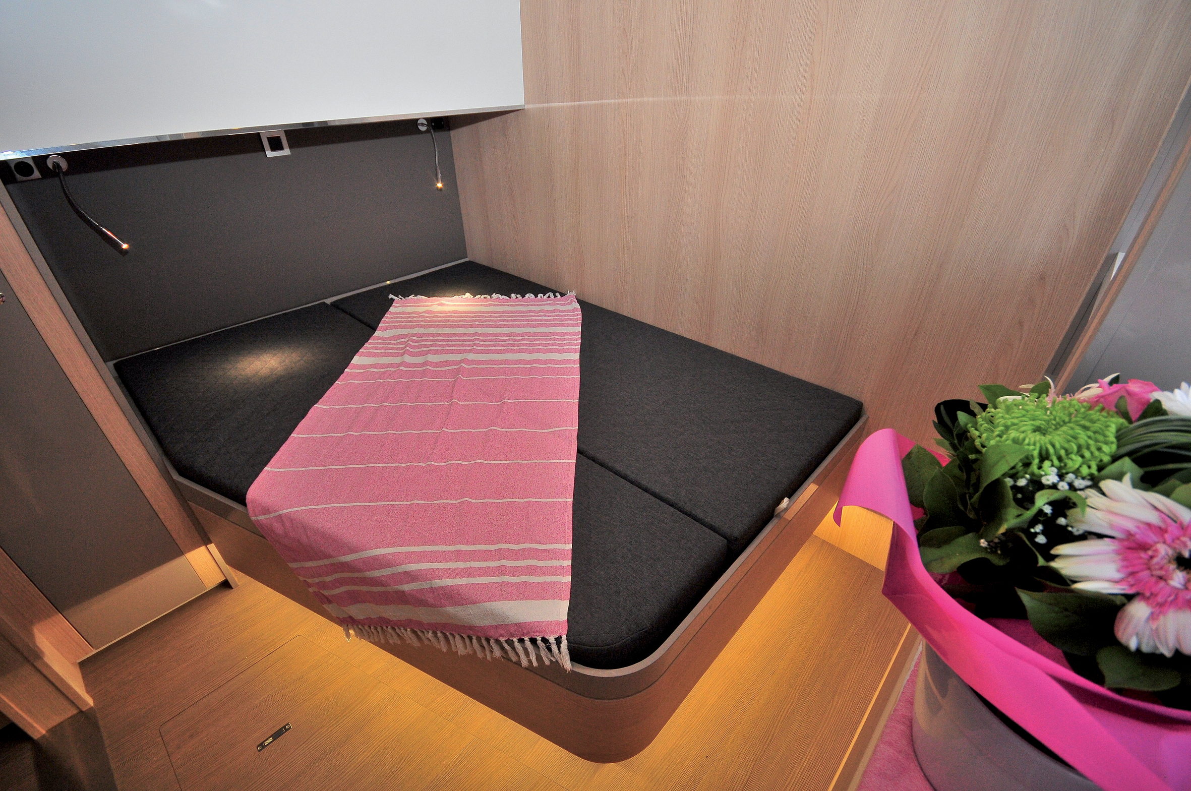 A l’inverse de la tendance majoritaire pour les catamarans de cette taille, le Bali 5.4 n’offre pas le traditionnel cockpit avec table, banquette et méridienne, mais recompose totalement ce volume arrière en le faisant fusionner avec le salon-loggia convertible (ouvert sur l’extérieur avec la baie basculante et les panneaux latéraux). Cette "révolution" va à l’encontre de l’option "cockpit lounge" choisie par les concurrents français ou sud-africains pour lui substituer une organisation de l’espace nacelle proche de celle proposée par Greg Young sur ses unités de day-charter ou sur le TAG 60’ (Multicoques No 159-Multihulls No 130), mais en ajoutant un nouvel espace de vie à l’avant. Si l’on excepte la confortable banquette transversale, l’arrière du navire est plutôt voué au rôle de zone d’échange entre l’intérieur et l’extérieur et d’accès aux jupes ou à la passerelle (lorsque l’annexe est à l’eau). Le plan d’aménagement prévoit un accès direct par l’extérieur aux deux cabines arrière (un surcroît de liberté pour les couche-tard ou les lève-tôt !) ; les 4 autres cabines (toutes dotées de WC et cabinets de toilette privatifs !) sont accessibles par 2 descentes latérales de part et d’autre de la table à cartes (qui sera mieux intégrée au bordé sur les futures unités afin de fluidifier le passage vers l’avant) et de la cuisine. Le plan de circulation dévoile de nouvelles possibilités et permet de rejoindre directement par une porte frontale l’immense cockpit avant : une solution sans équivalent, conquise sur le trampoline habituel pour offrir un espace de convivialité détente/bain de soleil/brunch/happy-hour digne d’une unité plus grande de 10’ ! Les volumes individuels de notre version 6 cabines sont à peine moins grands que ceux de certaines versions propriétaires traditionnelles, et répondent à l’attente première de chaque couple client : intimité et confort. Un exploit dans cette taille ! Le style net est efficace sans être impersonnel ; la sellerie, les accords de matières composent une atmosphère agréable et fonctionnelle qui se prête bien à la personnalisation par des apports décoratifs simples ; la menuiserie est de bonne facture. Les deux cabines équipage sont confortables et pratiques, leur accès individualisé par panneaux de pont se double d’une possibilité de secours par mauvais temps (une porte intérieure étanche) : bien vu !