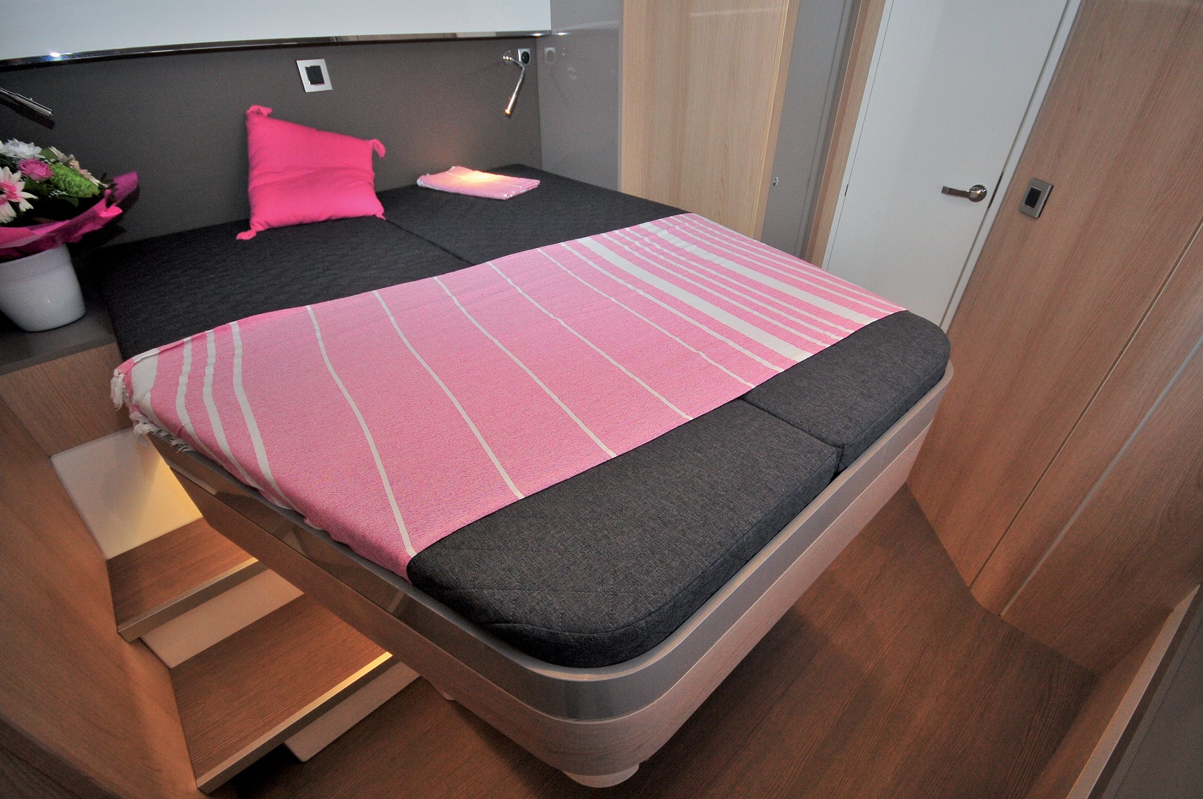 Le Bali 5.4 est équipé en monte d’origine avec les Yanmar 57 CV, cependant, les 80 CV semblent une option judicieuse pour un catamaran de ce volume. Ce 2 l turbo à rampe commune d’injection pèse 274 kg avec la transmission saildrive et il procurera les meilleures performances avec une paire d’hélices Autoprop à pas variable automatique (consommation 9 l/h/moteur à 2600 tr/mn). Le parc batteries (4 batteries 130 A au gel en standard, 2 supplémentaires en option) est logé sur un solide rack installé dans la cale tribord ; le tableau de connectique grosse puissance ainsi que le chargeur et le convertisseur 1600 W sont installés en façade sous l’escalier de descente de la cabine arrière tribord voisine ; une bonne solution pour raccourcir et alléger les réseaux ; le tableau de contrôle se trouve lui sous la table à cartes.