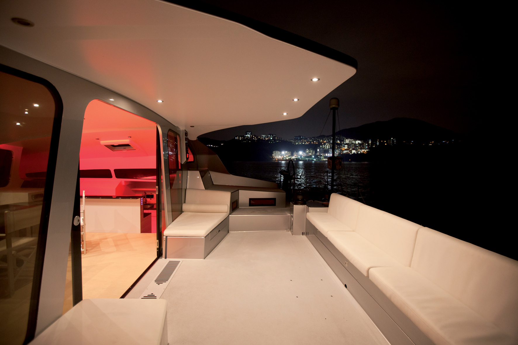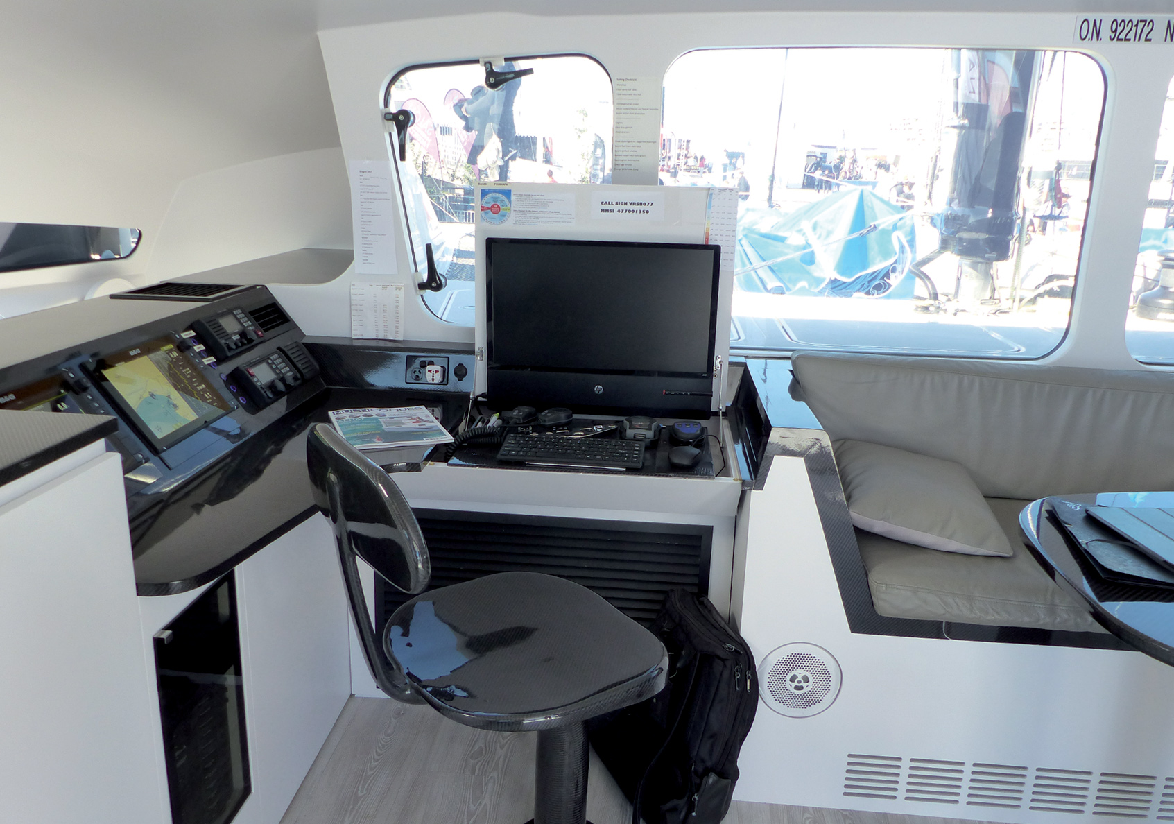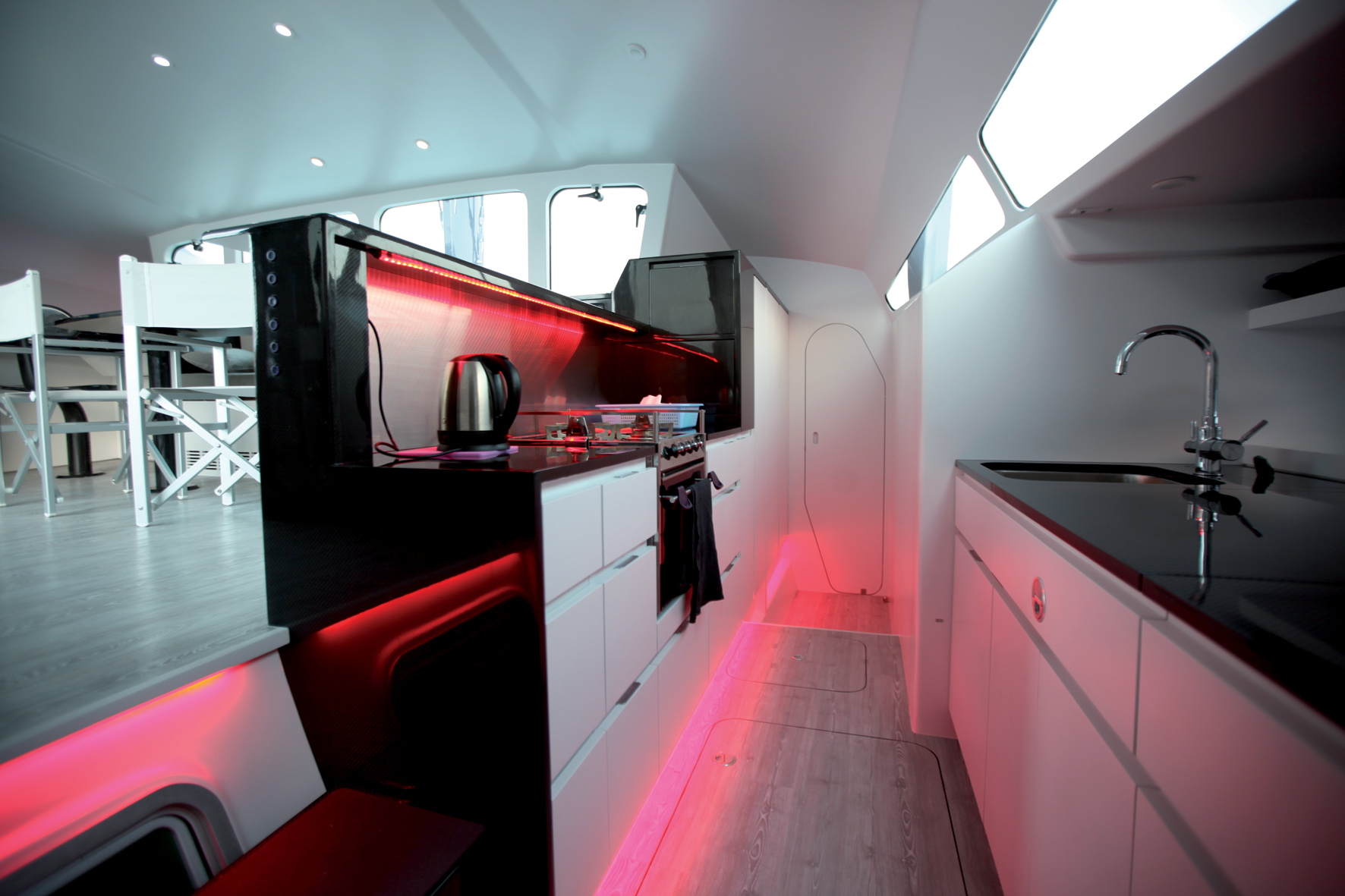 En montant à bord, on est d’emblée surpris par l’espace, certes un peu dépouillé, où la circulation s’effectue sans entrave de la jupe arrière au salon grâce à une double baie vitrée largement ouverte. L’utilisation d’une table pliable libère le cockpit, et l’ergonomie des marches pour accéder aux barres, aux postes de manœuvre et sur les passavants est très sécurisante. Aucune appréhension n’est perceptible lors des déplacements, qui peuvent être rapides et sûrs lors des manœuvres, nous le vérifierons en navigation. Cette sensation se retrouve à l’intérieur avec une perspective prolongée par les espaces décloisonnés des coques (d’où la nécessité d’une casquette en carbone). On trouve donc, en coursive, d’un côté une cuisine et de l’autre un salon home cinéma. Mais ces lieux de vie importants restent en contact permanent avec le carré via un comptoir. Deux marches à descendre suffisent pour se retrouver sur ces "demi-niveaux" situés sur les moteurs bien centrés et parfaitement insonorisés à l’aide de techniques que l’on retrouve sur les motoryachts.