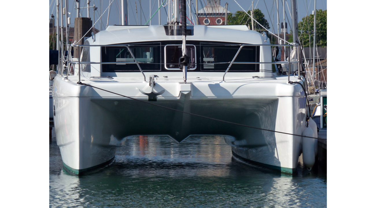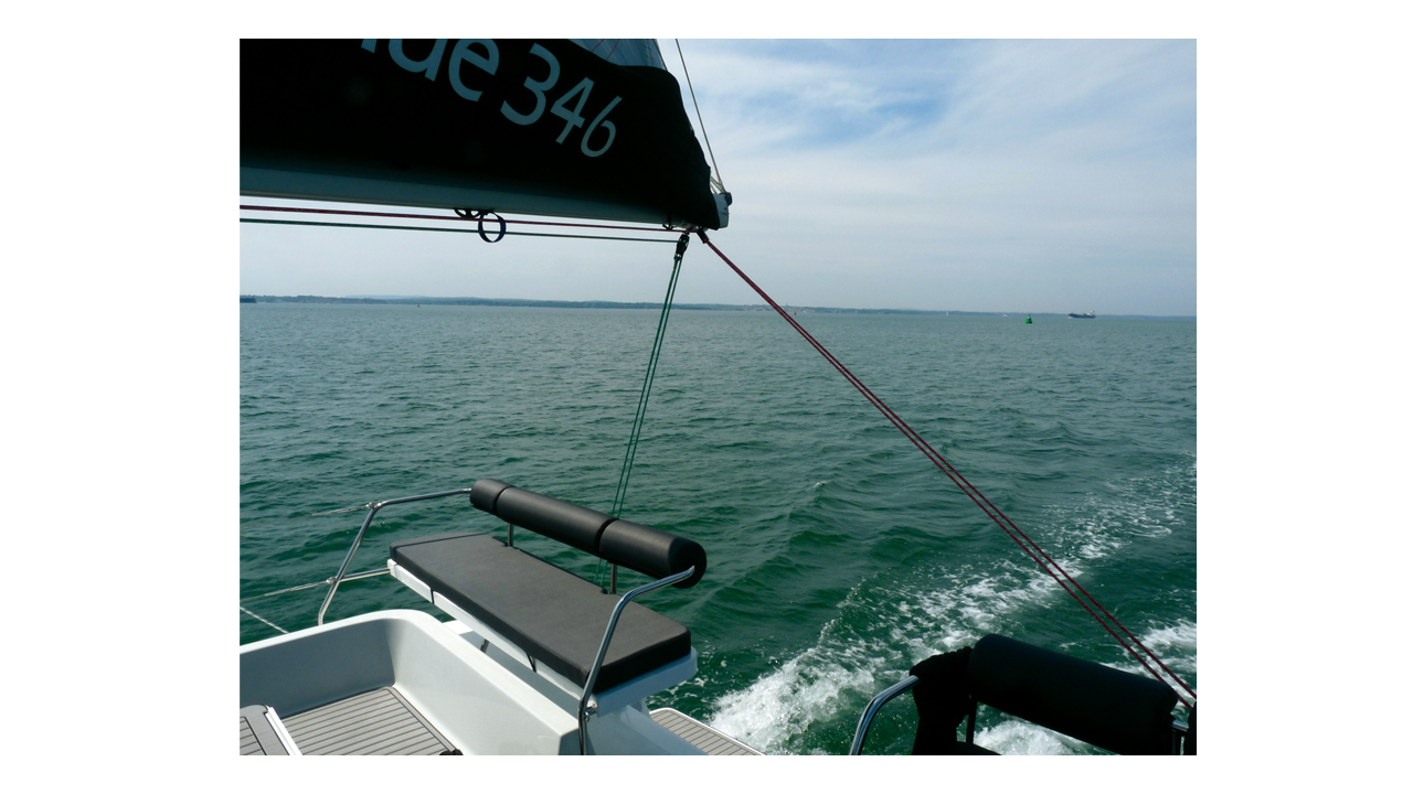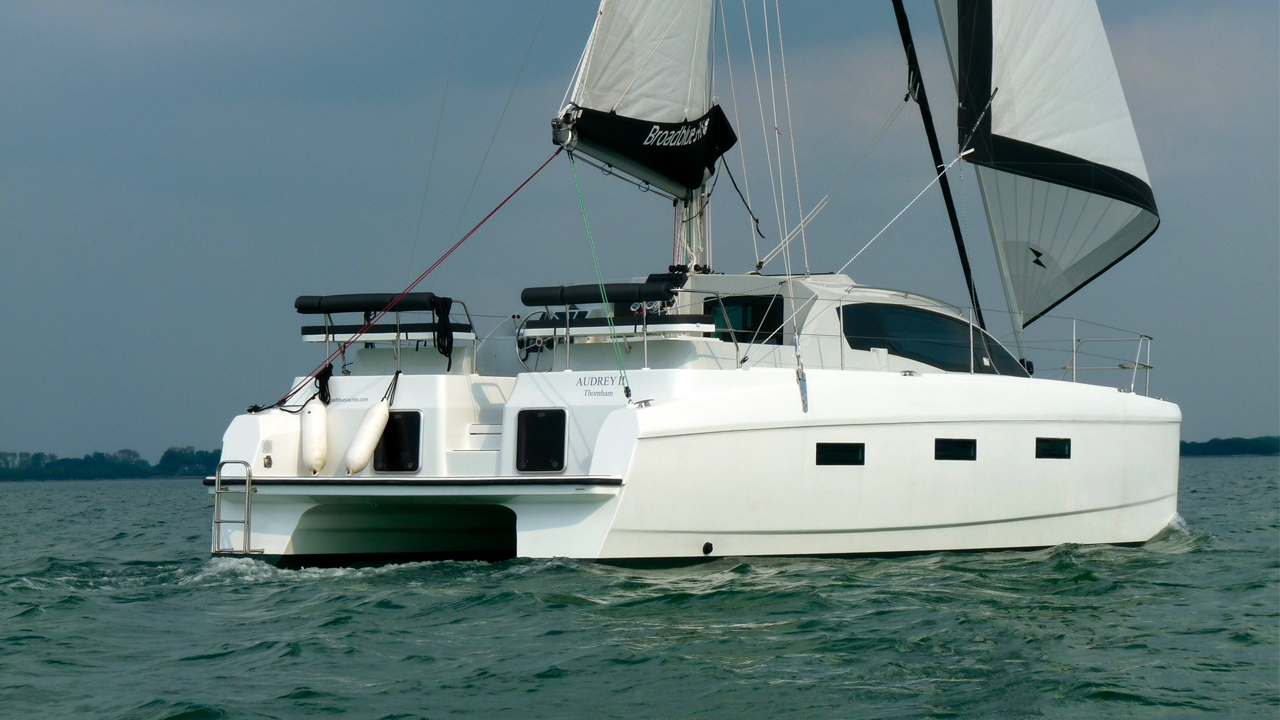 Le dessin des catamarans de conception moderne favorise des entrées d’eau fines, et le Broadblue n’échappe pas à la règle. Les coques disposent d’étraves fines et verticales, avec un bau s’élargissant jusqu’aux poupes. Un redan permet d’obtenir une ligne de flottaison assez fine, et plus de volume intérieur, tout ceci contribuant à des performances que je n’aurais pas imaginées sur un bateau de cette taille. Le jour de notre essai, un anticyclone couvrait le nord des îles Britanniques, une situation habituelle en cette fin de printemps, et nous avons eu sur la côte sud de l’Angleterre des vents légers de nord-est, aussi, je ne m’attendais pas à des performances miraculeuses… Sortir de l'étroite marina d’Haslar s’est avéré aisé avec les deux moteurs Beta Marine de 20 CV. La grand-voile a été facilement hissée avec le guindeau électrique, tandis que le foc autovireur était déroulé ; et déjà nous étions dans le solent, à l’extérieur du grand port de Portsmouth.La grand-voile Banks Sails de 40 m2 est à corne et fort rond de chute. Le mât Selden est précontraint, grâce à une double triangulation, et un seul étage de barres de flèche. Des galhaubans,des inters et deux étais en font un gréement très sûr. Quand le plan d’eau se dégage, nous échangeons le solent pour le gennaker (en option), et, avec un vent dépassant le travers, les instruments Raymarine nous indiquent que nous naviguons à un très respectable 7,3 nœuds. Mais attention, il y a moins de 10 nœuds de vent. Incroyable… mais vrai !Au retour, au près, nous avons louvoyé jusqu’à la marina Chichester, sous grand-voile et foc autovireur à nouveau. Les connaissances locales de Mark et le faible tirant d'eau du catamaran nous ont permis de nous approcher de la plage, de tirer le maximum de chaque virement de bord, et nous sommes rapidement entrés dans un grand port naturel, toujours à une vitesse respectable au près. Rappelez-vous que j'ai déjà parlé de piloter le bateau depuis la table à cartes ? Mark nous en a fait une superbe démonstration, et nous avons viré notre dernier bord dans le port… sans personne sur le pont.En nous dirigeant vers l'un des mouillages de Chichester, nous avons mouillé à East Head, et nous sommes arrêtés pour le déjeuner. Mouiller s’est avéré aisé, le guindeau étant contrôlé par les deux boutons poussoirs intégrés au pont avant. Il peut également être commandé depuis le poste de barre, bien que je ne trouve pas l’usage de l’interrupteur montée/descente très intuitif. Un petit détail qui devrait s’arranger avec l’habitude. La chaîne chemine sur le pont dans une réservation protégée au fond par de l’inox. Au fil du temps, des montées et descentes de la chaîne, il est possible que le gelcoat sur les parties verticales soient endommagée. La protection serait meilleure si les côtés étaient eux aussi recouverts d’inox. Autre avantage du pont rigide, la structure est plus raide sur l’avant, ce qui évite l’utilisation d’une martingale.Mis à part le fait que j'opterais pour une ancre de nouvelle génération de type Spade ou Rocna, plutôt que la Bruce montée sur notre bateau d’essai, j'ai été impressionné par la configuration du mouillage retenue sur le Broadblue.Le bateau n’est pas équipé de bossoirs, mais, avec la plate-forme arrière qui court sur toute la largeur, il serait intéressant de disposer d’un système basculant, cela devrait bien fonctionner. Même si nous n’avions pas d’annexe lors de notre essai, monter et descendre à bord du semi-rigide, pour faire les photos sous voile, s’est avéré facile depuis la plate-forme arrière. Cet endroit est également parfaitement adapté à la pêche, ou pour simplement s'asseoir et profiter d'un coucher de soleil au mouillage.