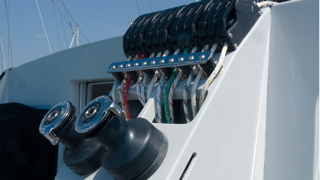 Mais le point le plus intéressant du cockpit est le poste de manœuvre. Il est positionné juste en dessous et en arrière du pied de mât, et on peut y faire absolument tout : hisser, réduire, régler, etc. On y trouve une douzaine de renvois, autant de coinceurs, ainsi que deux winchs Lewmar 40, dont un électrique. Les écoutes de génois se manœuvrent aussi depuis la console, via des anneaux de friction Antal. Les coinceurs et les winchs sont inclinés à 45°, ce qui peut sembler inhabituel, jusqu’à ce que Mark Jarvis, PDG de Broadlblue, explique l’histoire. De nombreux éléments de ce bateau ont été conçus à la suite de remarques de clients, et ce choix a été fait pour répondre au souhait d'un mari et d'une femme qui voulaient tous deux pouvoir tout faire à bord. Lui mesure 1,90 m, et elle 1,60 m, donc, si les winchs avaient été montés horizontalement, ils auraient été trop hauts pour elle ou trop bas pour lui. L’inclinaison à 45° les positionne à une bonne hauteur pour les deux, et pour les autres aussi ! Notre essai a permis de valider ce choix.Le fond du cockpit, ainsi que la plate-forme arrière, sont recouverts de Seadek. Il s’agit d’un revêtement qui n’a pas été conçu pour ressembler à du teck, mais il est confortable aux pieds, et sa couleur claire ne devrait pas le rendre trop chaud sous les tropiques, ou en Méditerranée. Il est également sensiblement plus léger que les faux tecks.Plus sur l’avant, de jolis passavants, bien dégagés courent sur toute la longueur du bateau, avec une main courante en inox le long du rouf. Point intéressant, on compte sur le passavant pas moins de quatre taquets, dont un très utile au milieu pour y frapper des gardes. Ce bateau a clairement été conçu par quelqu'un qui navigue. Plus vers l’avant, il n’y a pas de trampoline entre les coques, mais un pont avant rigide. Comme je l’ai déjà mentionné, ce bateau a un franc-bord élevé, ce qui implique une bonne hauteur sous nacelle, ce qui signifie, entre autres, que ce pont avant ne tapera pas dans la mer. On y trouve le guindeau électrique Lewmar, ainsi qu’une vaste baille à mouillage, suffisamment grande pour y stocker les pare-battages et les amarres.