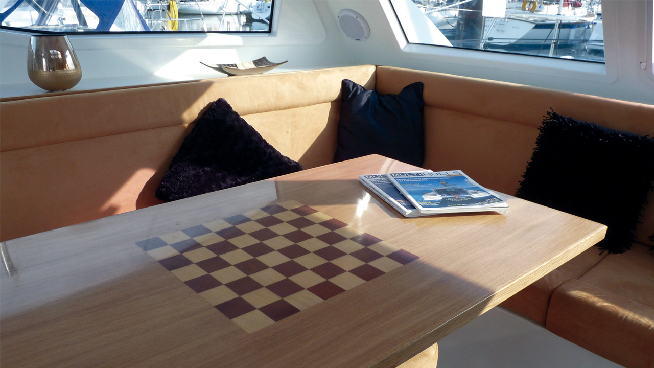 Le carré est joli et lumineux, et la première chose qui me frappe, c'est la table et le carré. En effet, le plateau en bois comporte un échiquier incrusté. Je suis immédiatement conquis par ce bateau ! La qualité du travail de menuiserie est celui qu’on s’attendrait à rencontrer à bord d’un bateau plus haut de gamme. La table mesure 135 cm par 75 cm, et, avec un banc en L sur deux côtés, auquel se rajoutent les deux tabourets pivotants (ceux qui peuvent également être utilisés dans le cockpit), six à huit personnes peuvent y manger confortablement.