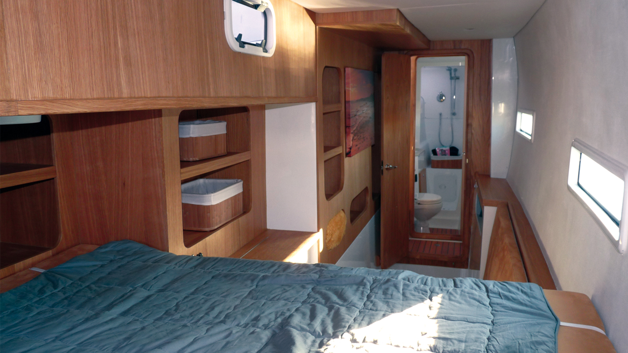 Mais nous y reviendrons plus tard.En descendant dans la coque tribord, on a l'impression de pénétrer dans la suite d'un plus grand cata. A l'arrière se trouve la cabine double, avec sa couchette de 2 m x 1,6 m (eh oui, plus grand que votre lit à la maison), mais, avant d'y arriver, on traverse une coursive de 2,60 m, avec une assise d’un côté, placards et étagères de l’autre. L’ensemble de la cabine mesure de fait 4,60 m de long. La couchette est haute, mais on utilise la banquette pour y accéder facilement. En avant de la descente, se trouve la salle de bains. Elle mesure 2,40 m. On y trouve un WC électrique, un lavabo et une douche séparée. Un placard, avec ses portes en miroir, prend place au-dessus du lavabo, sa partie arrière pouvant être retirée pour accéder à des systèmes techniques. Sous le lavabo, certains câblages pourraient être mieux organisés et protégés.L'éclairage naturel est abondant, avec deux longs hublots dans la cabine sur le bordé extérieur, un petit panneau qui ouvre dans le cockpit, et un plus grand qui donne quant à lui sur la plate-forme à l’arrière. Il y a beaucoup de spots LED, ainsi que des prises 12 V et 220 V dans les cabines et le carré, et des prises USB à la table à cartes.La coursive bâbord se trouve juste en avant de la cloison principale, accessible de nouveau par trois marches. A l'arrière, une autre cabine double avec un lit de la même taille qu'à tribord, mais il est cette fois-ci positionné perpendiculairement à la marche et non longitudinalement. Il y a moins d'espace que dans l’autre cabine, mais elle dispose aussi d’une banquette et de beaucoup d'espaces de rangement. Plus en avant prend place une autre couchette simple, et, bien qu’elle soit assez étroite au niveau des pieds, elle est tout de même assez spacieuse et on y trouve même un toilette et un lavabo. Entre ces deux cabines, l’espace disponible permet une grande zone de stockage, où il serait facile d’implanter une autre couchette.Au total, ce catamaran dispose de plus de volume et d'espace de vie que ce à quoi on pourrait s’attendre sur un bateau de cette taille.