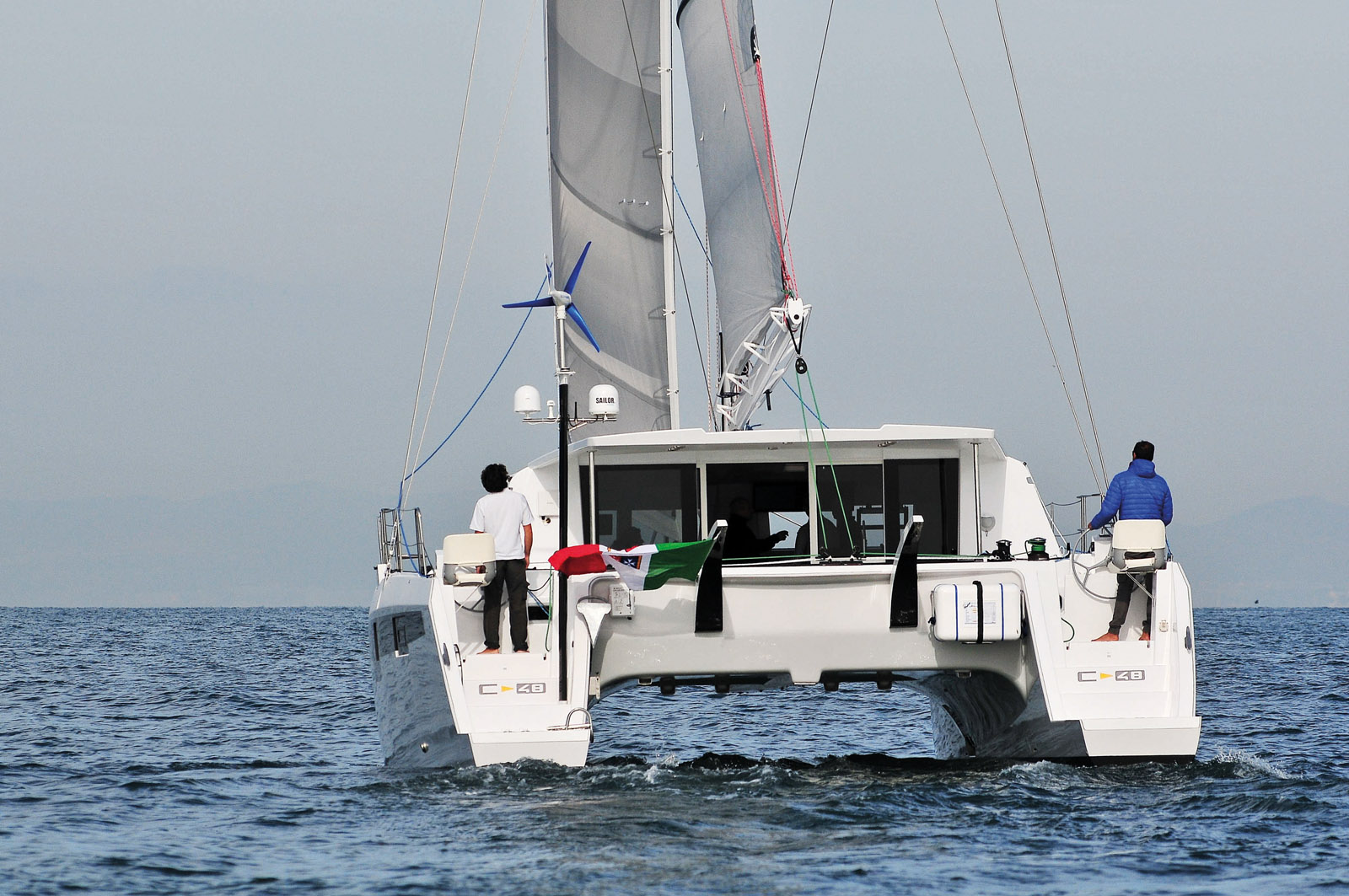 Notre première séance d’essai s’est déroulée avec un vent d’ESE de 5 à 10 nœuds et une mer plate. Autant le signaler d’entrée de jeu : le C-Cat 48 fait merveille dans ces conditions légères. Il ne s’agit pas d’un multicoque de régate, mais il est plaisant de constater qu’un catama- ran aussi confortable à l’intérieur peut se montrer véloce alors que le vent décoiffe à peine le barreur… Le déplacement contenu, l’aérodynamique épurée, la finesse des entrées d’eau et le plan de voilure généreux expliquent ce bilan très positif dans le petit médium. Pour cette première sortie, nous avions gréé le génois sur le stockeur. Avec ses 53 m2 et son recouvrement, cette voile d’avant permet au C-Cat 48 de rester manœuvrant et vif à toutes les allures. Bien sûr, la toile du jour était le gennaker ; grâce à cette voile de 130 m2 aux membranes bloquées – tout comme celles de le grand-voile –, l’allure de notre catamaran est restée constamment dynamique à tous les angles, avec une barre ferme et sensible. J’ajoute que c’était un plaisir de se mou- voir aussi rapidement sur ce plan d’eau parcouru par d’autres unités… au moteur. Le lendemain, nous avons eu droit à des conditions plus soutenues – 12 à 18 nœuds et une mer agitée. Le clapot rencontré a permis de mettre en évidence le très bon passage à la vague de ce catamaran – la hauteur de nacelle généreuse et les poids bien centrés contribuent bien sûr à cet excellent comportement. Sous trinquette, nous étions un peu sous-toilés dans l’attente d’un front finalement retardé. Nous avons atteint toutefois aisément la vitesse de 9 à 10 nœuds. Le comportement du 48 est plaisant à la barre, laquelle reste précise malgré l’inertie des vérins et pilotes associés. Un échange avec Massimo Guardigli a confirmé la nécessité d’un changement d’hélices – effectué depuis. L’objectif est bien sûr de réduire la traînée, et donc d’augmenter la vitesse. Au bon plein, nous n’avons pas dépassé 11 nœuds. Nous aurions pu grimper à 13 si nous avions réinstallé le génois. Une mention spéciale pour le plan de pont : tout fonctionne parfaitement avec une maturité ergonomique qui ne laisse pas supposer qu’il s’agit d’un n°1. Le traveler, servi par deux winches électriques, est très agréable à régler. Quant à l’ergonomie des postes de barre, elle est excellente.