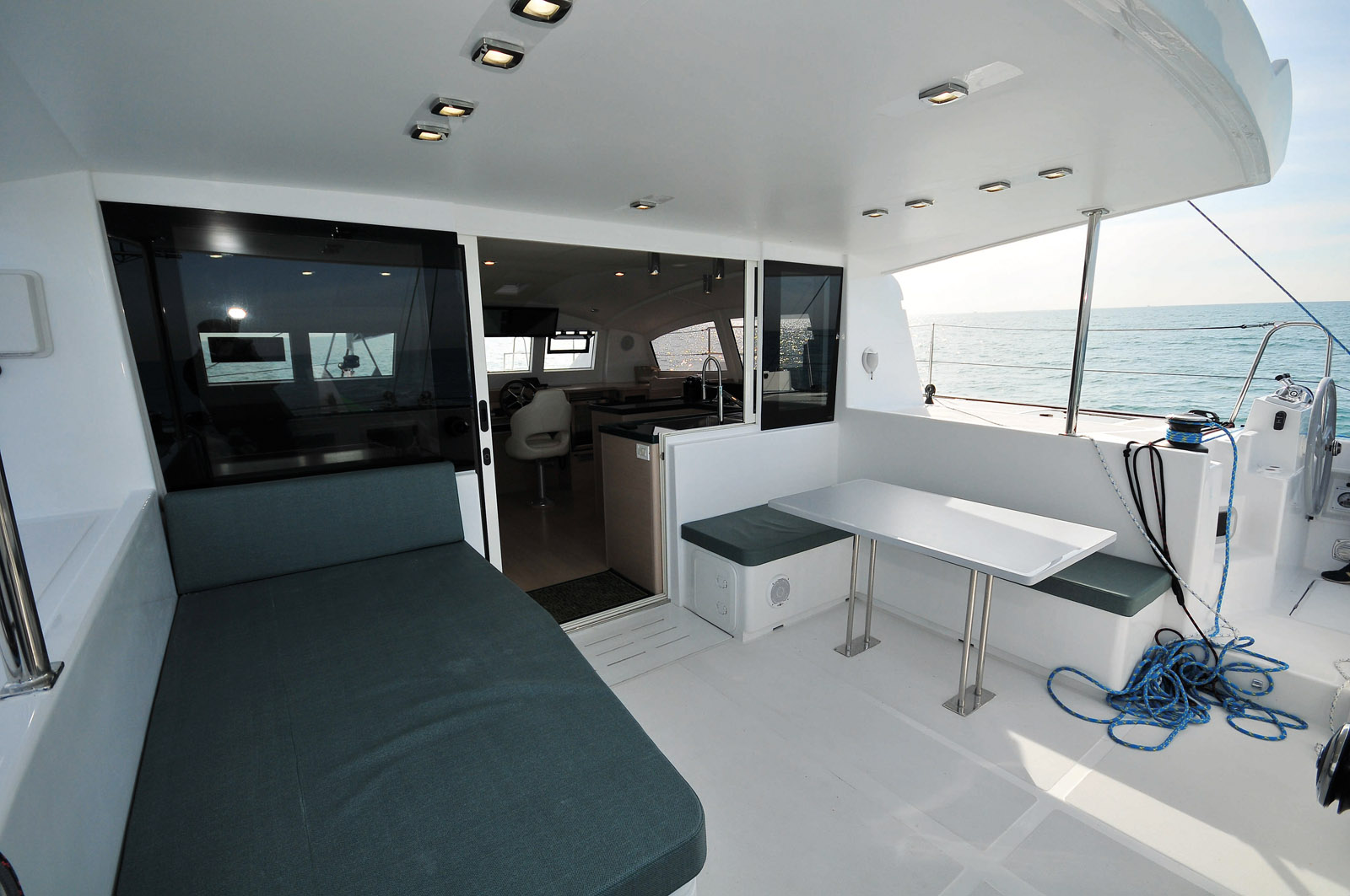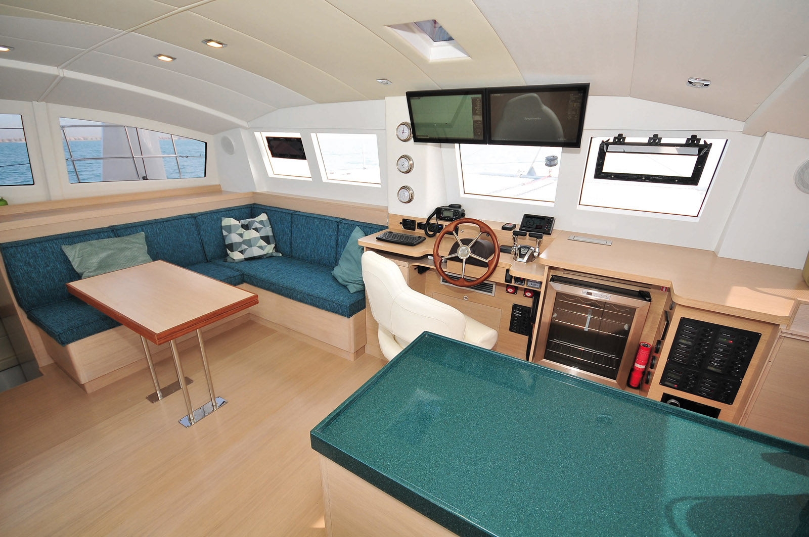 Le cockpit accueille une table, mais également la zone de manoeuvres, à l’image de la barre d’écoute animée par deux winches électriques.
