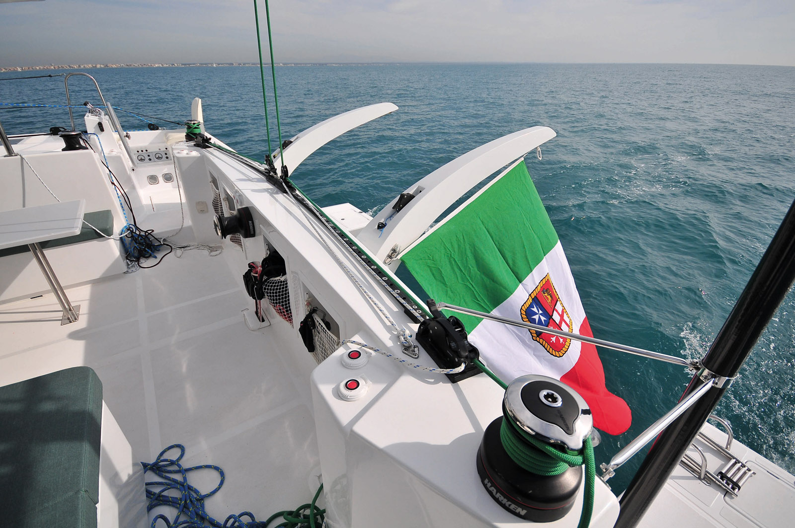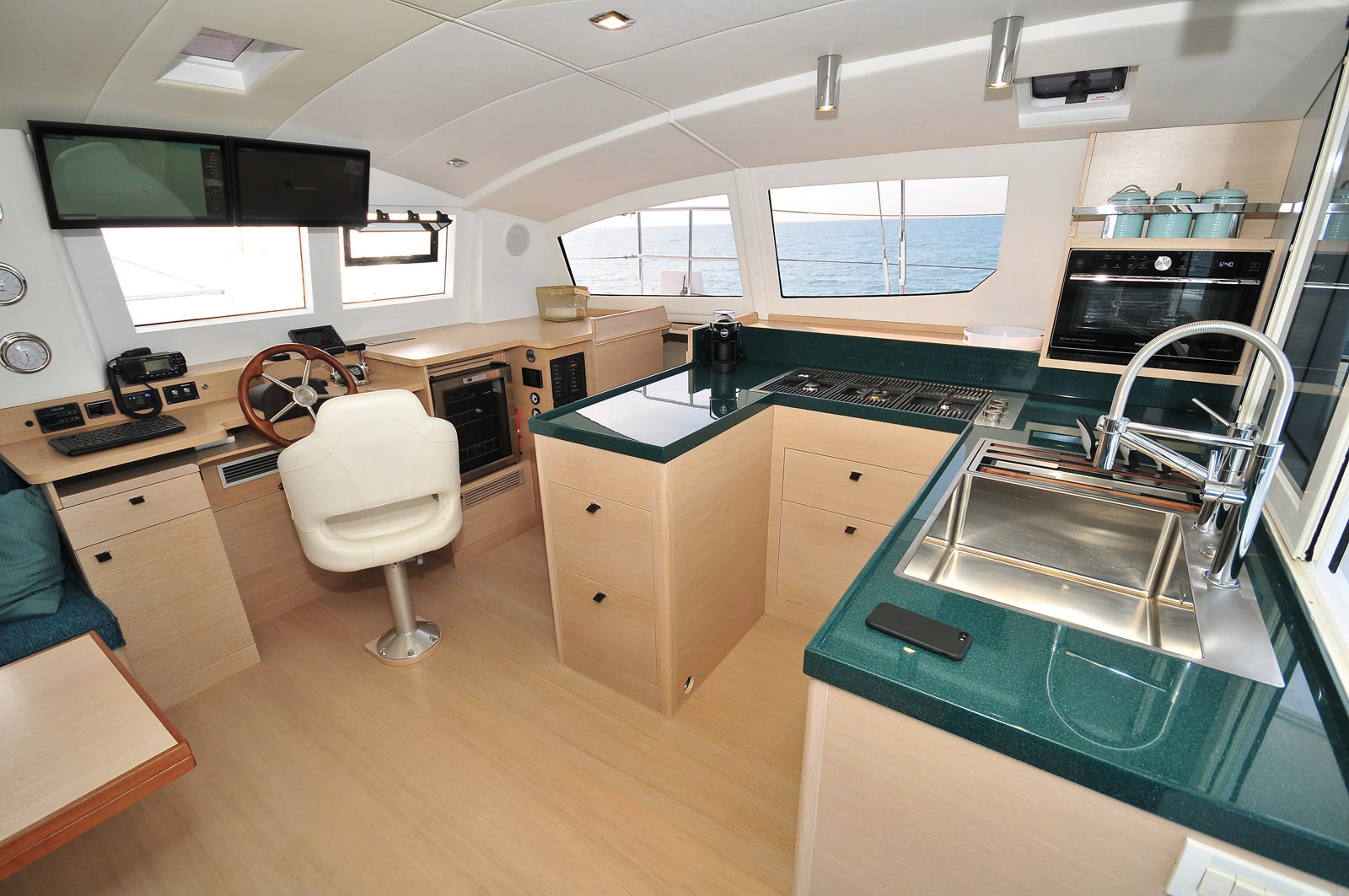 Les barres à roue ont été installées sur les coques, de façon à bénéficier d’une belle vision du plan de d’eau – et des voiles.