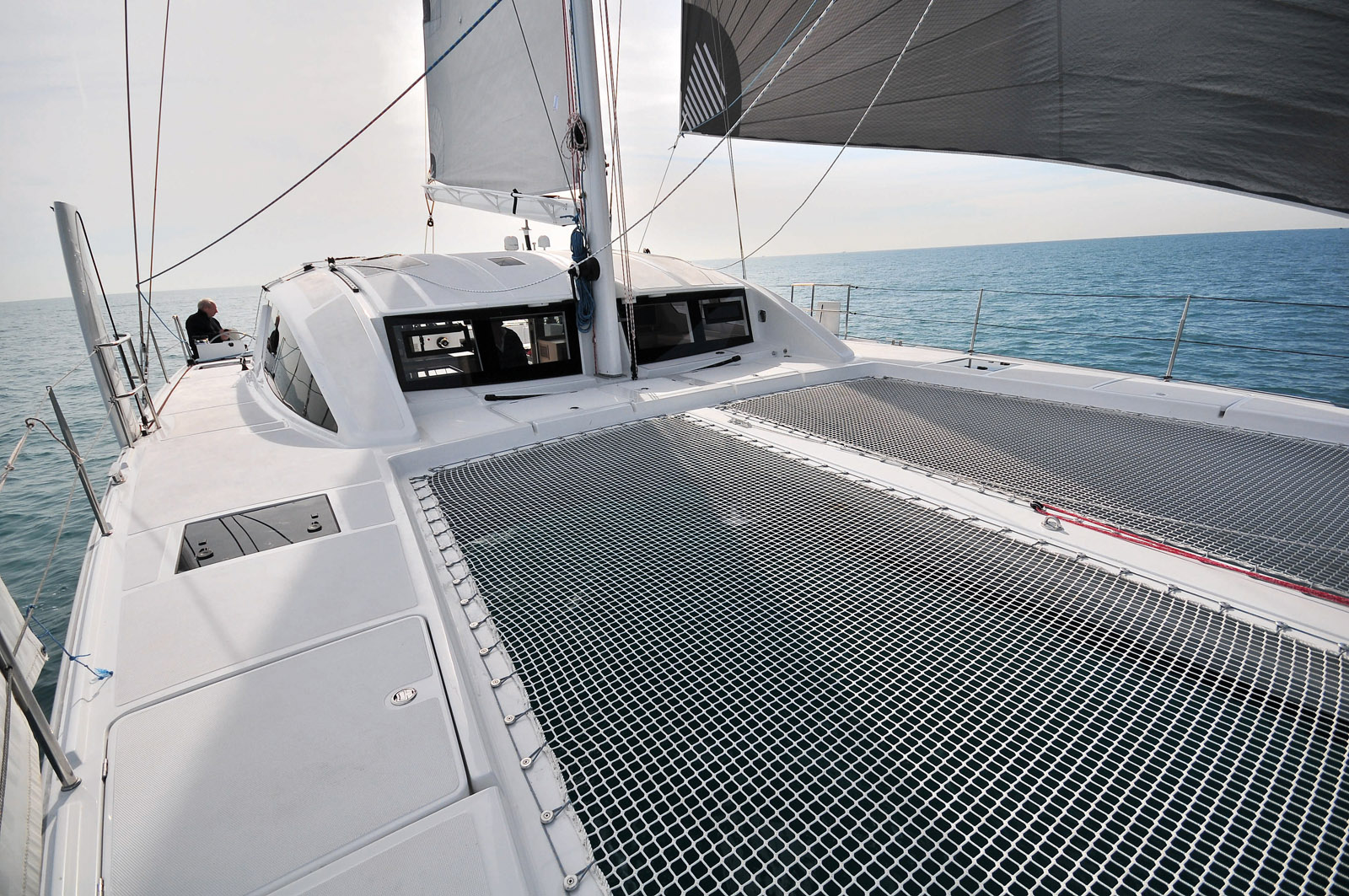 Le plan de voilure est modérément élancé (longueur du mât de 19,70 m pour des coques de 14,80 m). Pas besoin de verser dans l’excès avec un déplacement lège contenu à 8 tonnes !