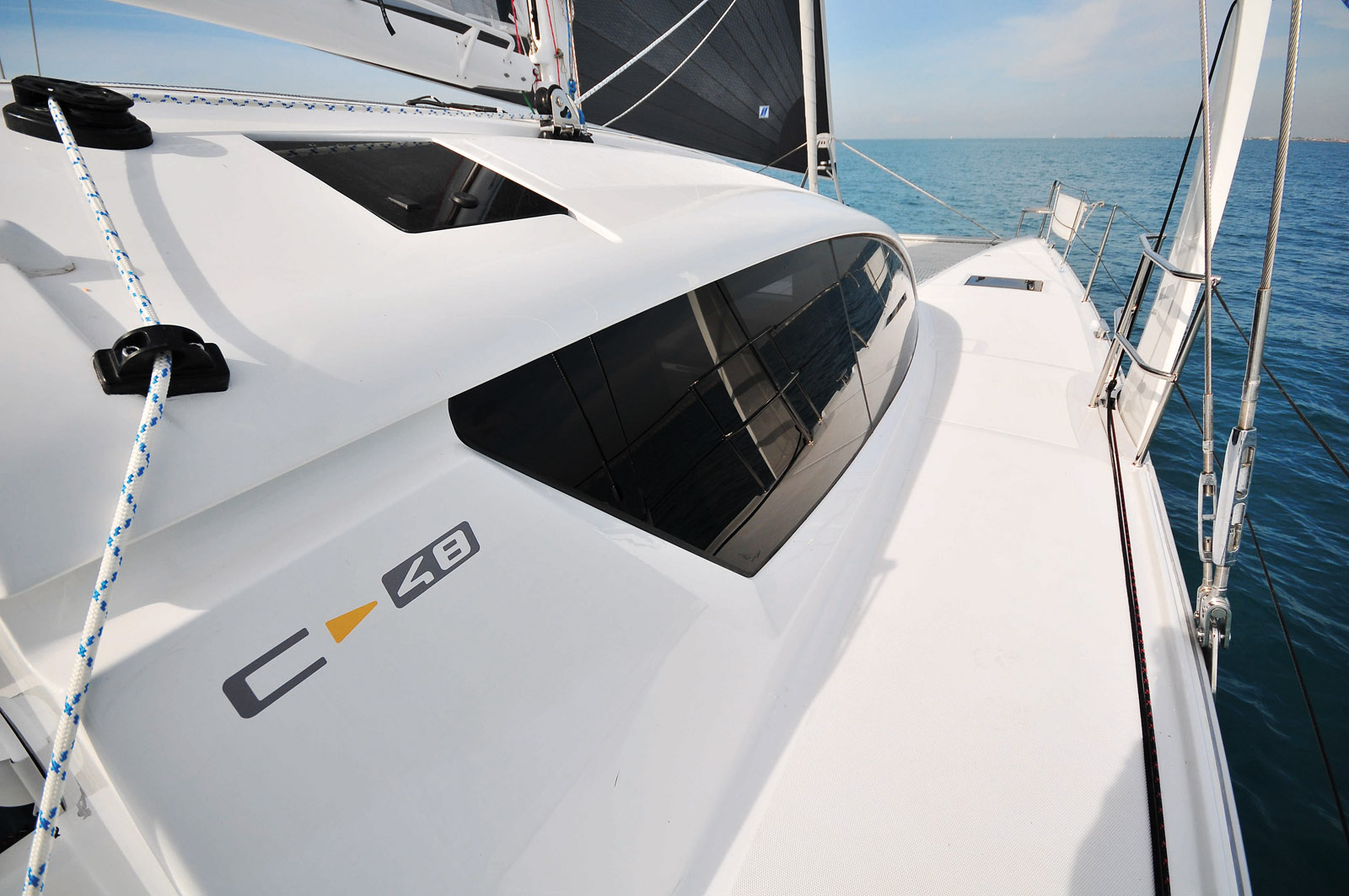 « Nous avons suivi un cercle vertueux dans la conception du C-Cat 48 afin d’obtenir un catamaran simple et léger, les deux allant de pair ! Attention portée au centrage des poids, construction sandwich en une seule pièce (coques et nacelle), carènes tendues et silhouette aérodynamique sont autant de facteurs qui contribuent à construire un multicoque marin et réactif. Les postes de barre reculés et abaissés sont en lien avec le reste du catamaran ; ils permettent de bien visualiser les voiles et l’ensemble du pont tout en ayant tous les bouts à portée de main. Simple et sécurisant pour profiter de la navigation en multicoque ! »