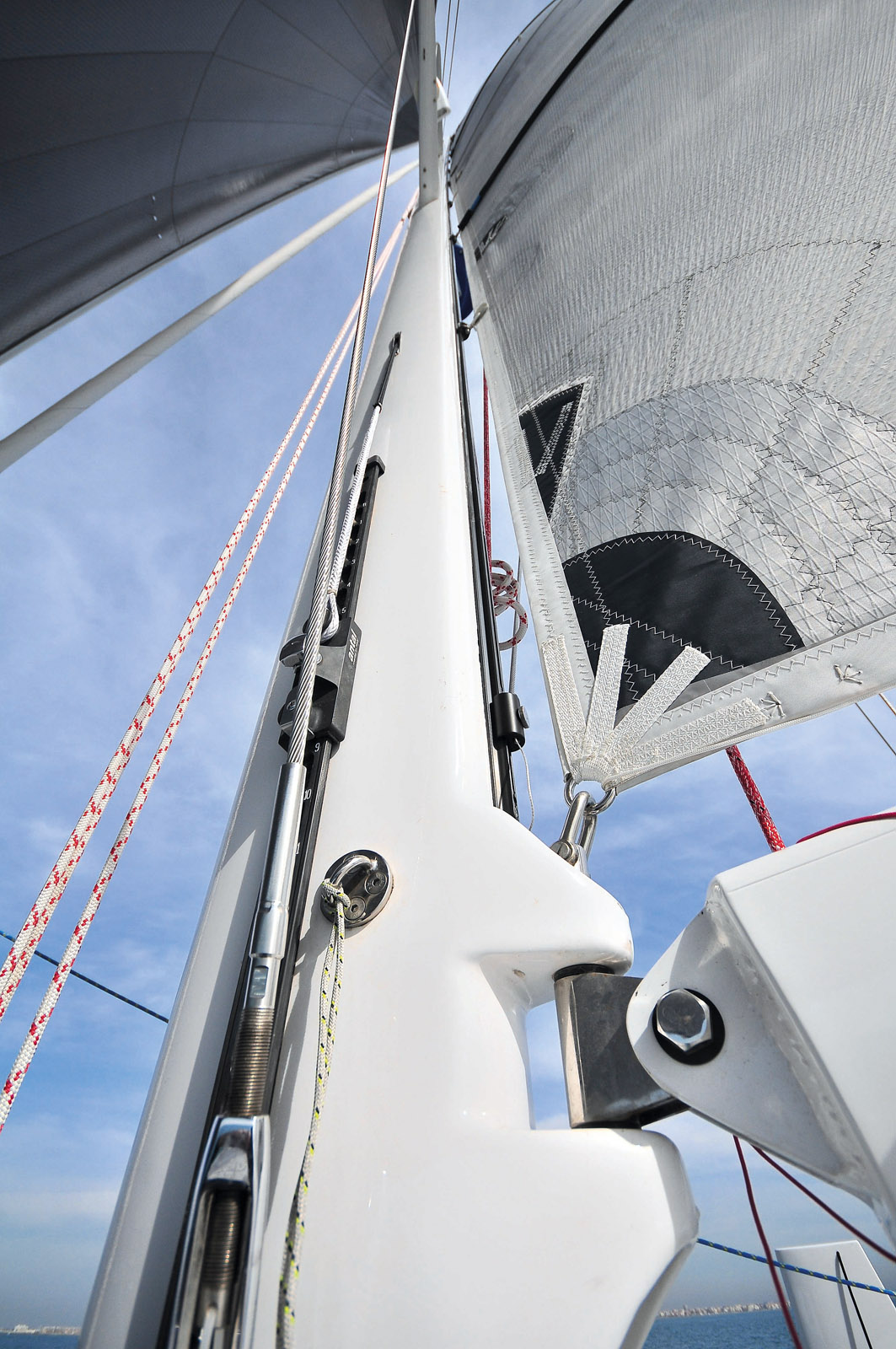 Le mât carbone fixe est proposé en option ; l’espar présente une faible corde et deux étages de barres de flèches poussantes.