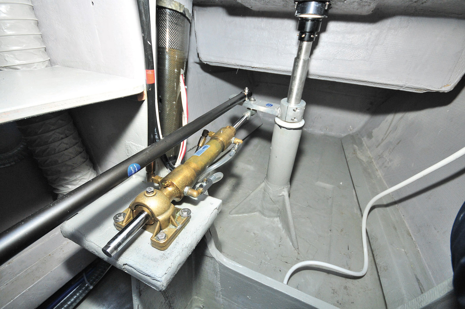 Plomberie plastique, électricité, cheminements de câbles et boîtiers périphériques sont donc sérieusement installés. La motorisation 2 x 35 CV Lombardini est de série, mais les transmissions par arbre constituent une option (très pertinente) sur notre catamaran d’essai. Il y a de la place dans les compartiments sous les couchettes arrière ; cette disposition permet l’avancement des moteurs dans les coques pour un meilleur centrage des poids. Les transmissions Jefa proposées sont évidemment irréprochables, mais le propriétaire de ce n°1 a souhaité une liaison intersafrans hydraulique. Les prochains exemplaires seront dotés d’une biellette mécanique, à mon sens préférable. Bravo également pour l’installation des safrans, des bras de mèches et des tubes de jaumières sérieusement équerrés.