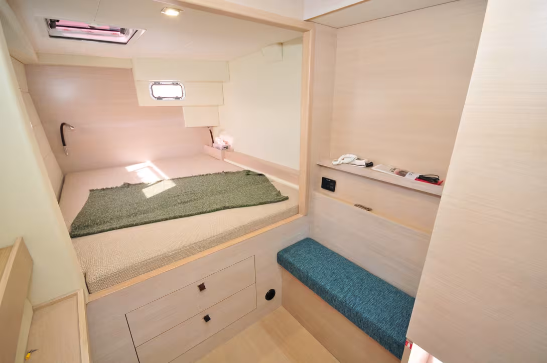 Le style Urban Chic moderne s’est aujourd’hui imposé à bord de la quasi-totalité de la production de multicoques ; il s’agit d’un agréable compromis entre design tendance, ergonomie consensuelle et matériaux contemporains. L’exécution de ce concept incontournable par C-Catamarans est irréprochable. Sans bousculer les codes, le chantier de Fiumiccino apporte une griffe italienne séduisante, réhaussée par une qualité de fabrication remarquable. La philosophie du constructeur est ouverte à la personnalisation, il est donc possible pour le futur propriétaire de participer activement à la réalisation de « son » catamaran. Notre exemplaire d’essai propose par exemple un choix d’essences très claires et des vaigrages soignés et superbes. Le plan de travail de la cuisine en U est en Corian vert foncé, tranchant avec goût avec une magnifique sellerie bleue maison – bravo ! Très équipé en vue d’un programme exigeant de vie à bord, notre prototype est un peu plus lourd que les exemplaires à suivre (air conditionné, chauffage, générateur…). Le chantier affirme aussi pouvoir gagner plus de 800 kg sur les futures platesformes. Cette version propriétaire est bien plus que convaincante, nous avons particulièrement apprécié le traitement de la lumière, l’accessibilité intérieure-extérieure de la cuisine et la qualité générale de fabrication.