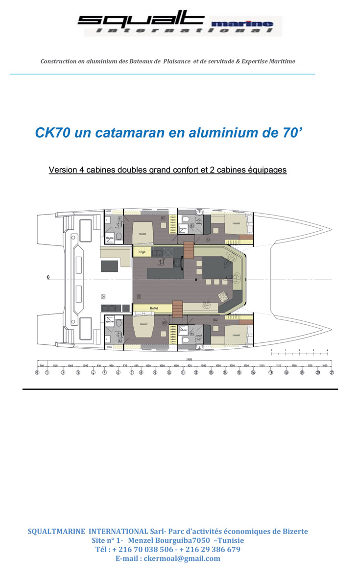 Rendez-vous a été pris une semaine après le Cannes Yachting Festival ; le grand catamaran n’est pas loin, il s’est juste aventuré à quelque 30 milles plus à l’est, à toucher la frontière italienne. Un saut de puce pour ce multicoque qui vient de traverser la Méditerranée. Ce CK70 a en effet été construit à Bizerte, en Tunisie, par Squalt Marine International. Ce chantier de 3 000 m2 jouxte celui d’Aventura Catamarans ; il compte une quarantaine d’employés et est animé par Claude Kermoal, reconnu dans le monde du nautisme – tant dans la spécialité plaisance que dans la spécialité servitude. Notre homme a déjà construit plus de 20 catamarans en aluminium, a fait partie de l’aventure Catlantech, organisé des charters à Dubaï, travaillé au Vietnam, rejoint Alumarine… Une carrière presque entièrement dédiée aux multicoques ; d’ailleurs, Claude se souvient : « La première fois que je suis monté à bord d’un catamaran, c’était en 1982, à bord d’Elf Aquitaine qui venait de remporter la Route du Rhum avec Marc Pajot à la barre. » Claude est installé depuis 6 ans en Tunisie. Le CK présenté aujourd’hui par le constructeur – qui reprend tout simplement ses initiales – est le troisième (et aussi le plus grand) de la gamme mis à l’eau.