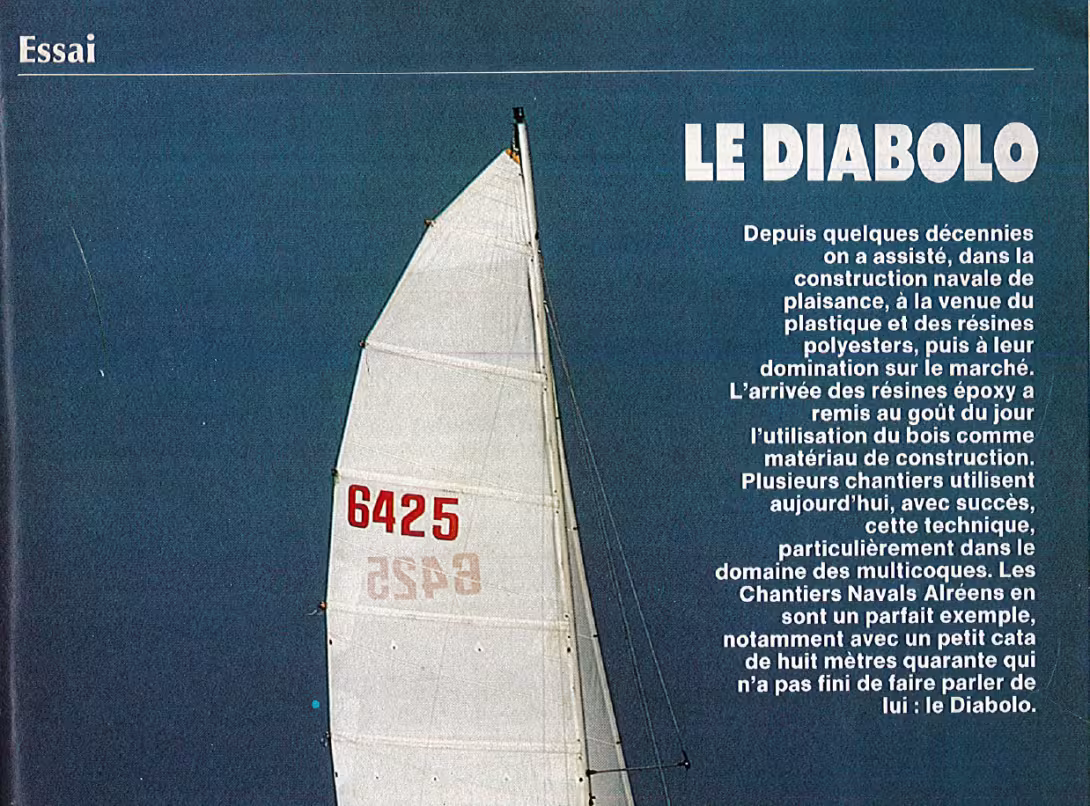 Depuis quelques décennies on a assisté, dans la construction navale de plaisance, à la venue du plastique et des résines polyesters, puis à leur domination sur le marché. L'arrivée des résines epoxy a remis au goût du jour l'utilisation du bois comme materiau de construction. Plusieurs chantiers utilisent aujourd'hui, avec succès cette technique, particulièrement dans le domaine des multicoques. Les Chantiers Navals Alréens en sont un parfait exemple, notamment avec un petit cata de huit mètres quarante qui n'a pas fini de faire parler de lui : le Diabolo.