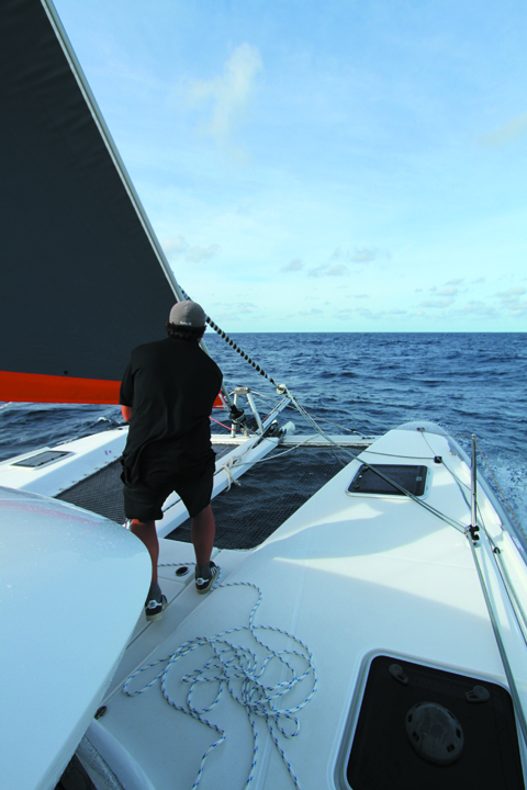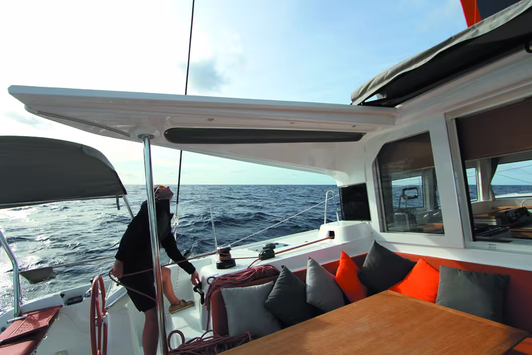Le barreur, généralement installé au vent, se régale : la barre est précise, et la vue sur le plan de voilure et le plan d’eau n’est que partiellement masquée par le rouf. Un mini bimini assure une protection contre les rayons du soleil les plus verticaux – et la pluie si le vent n’est pas trop fort. Un système de sièges rabattables a été mis en place. Assis, on y est bien installé – et même à deux, puisque les assises font 1,50 m –, d’autant que des cale-pieds sont prévus. Les charnières sont un peu agressives, présentent du jeu, et les dossiers se rabattent tout seuls au largue – des points à améliorer. Le point fort du cockpit, outre sa très grande surface, est son bimini ouvrant : une grande toile fait office de capote. La facilité de mise en place est perfectible, mais le plaisir de naviguer « décapoté » quand les conditions le permettent est indéniable. Une (excellente) idée piquée à la gamme monocoque Sense. L’accès à la bôme reste possible par les côtés du bimini, sans jouer les acrobates. En option, le constructeur propose un jeu de toiles pour abriter complètement le cockpit ; idem pour les postes de barre. La table extérieure mesure 160 cm par 55 cm. La banquette arrière, quant à elle, fait 175 cm. Le rouf présente sur l’extérieur une saignée, laquelle fait office de main courante. La circulation vers les grands trampolines est donc parfaitement sécurisée – d’autant que la largeur des passavants excède toujours 65 cm.