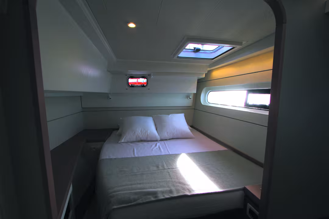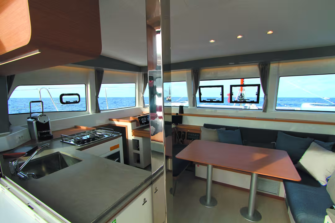 L’entrée de la nacelle, à l’instar des Lagoon, ne cède pas à la tendance Open : le vitrage vers l’arrière, d’accord, mais l’entrée de plain-pied reste classique avec 62 cm de largeur en bas et 140 cm en haut. La hauteur sous barrot est généreuse, avec ses 2,10 m. Bien que moins profonde que celle du Lagoon 40, la nacelle conserve un beau volume avec une table de carré de 116 cm par 74 cm et un coin navigation travers à la marche – le plateau mesure 84 cm par 58 cm. La cuisine en L est très complète et bien pourvue en rangements. On peut opter pour un réfrigérateur ou un congélateur supplémentaire, et même un écran multifonction que disparaît dans son meuble. La coque bâbord de notre modèle d’essai est dédiée au propriétaire – grand couchage facilement accessible, bureau, rangements, salle de bains. La coque tribord accueille deux cabines. Toutes sont bien aérées par trois panneaux ouvrants à l’arrière et deux à l’avant. L’Excess de décline en quatre cabines et deux salles de bains ou quatre pièces d’eau – cette dernière version conviendra parfaitement au charter, mais sacrifie quelque peu la largeur des couchages avant. A l’intérieur, la lumière abondante, les tissus de couleurs gaies et les boiseries claires sont plaisants : on se sent bien à bord. Plusieurs ambiances sont proposées – Work hard play hard, Less is more et Fast and curious. Un clin d’œil à une clientèle moderne et connectée…