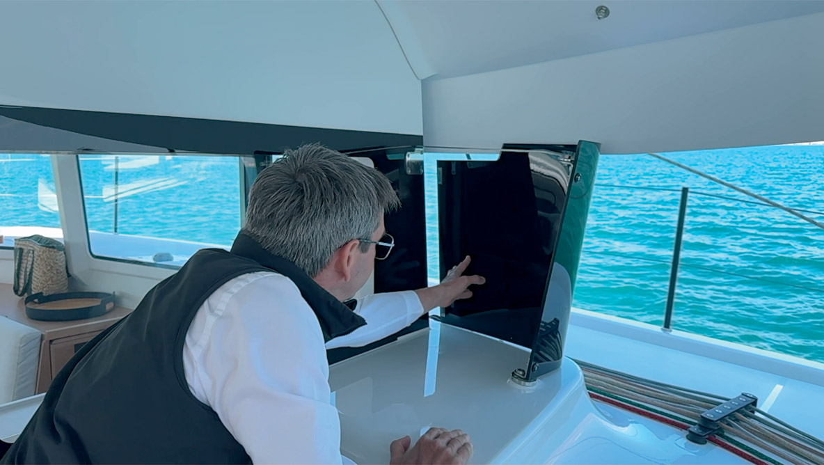 Les jupes arrière basculantes permettent d’embarquer facilement à bord. Je remarque le design futuriste des bossoirs, l’imposante portée des banquettes de barre basculantes et les biminis de protection au design aérien. Le cockpit est vaste, bien protégé par le bimini rigide qui prolonge le rouf et offre de nombreuses assises avec une table extérieure décalée sur bâbord. L’ouverture de la nacelle ne cède pas à la tendance XXL, et ce n’est franchement pas gênant.