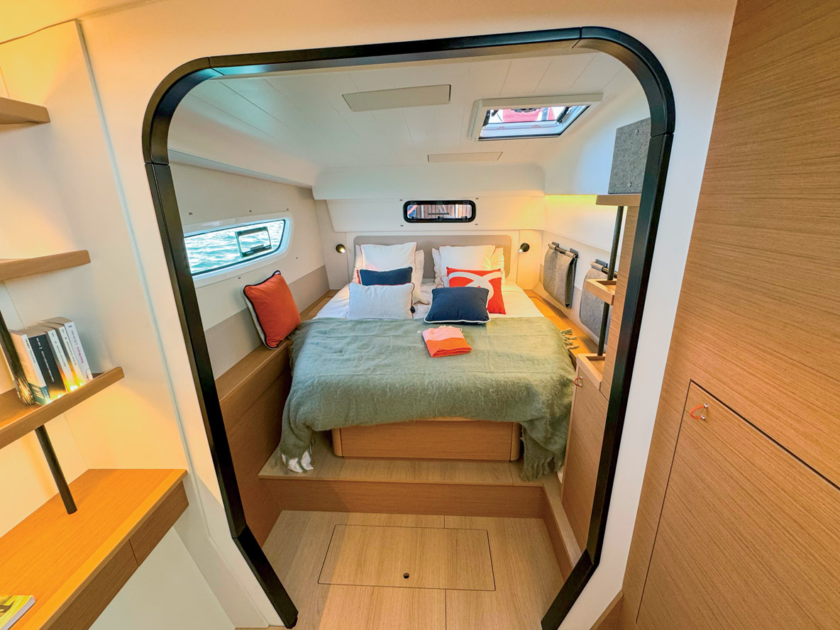 Le mobilier mêle bois clair mat, tissus texturés et finitions sobres, dans une palette douce qui reste dans le même esprit que celui des autres catamarans de la gamme. Le carré modulable peut accueillir confortablement l’équipage autour d’une grande table convertible ; quant à la circulation entre les espaces, elle est fluide, même en navigation. Chaque détail semble avoir été soigné : les lignes sont tendues mais chaleureuses, les éclairages indirects bien positionnés, les assises bien dimensionnées.