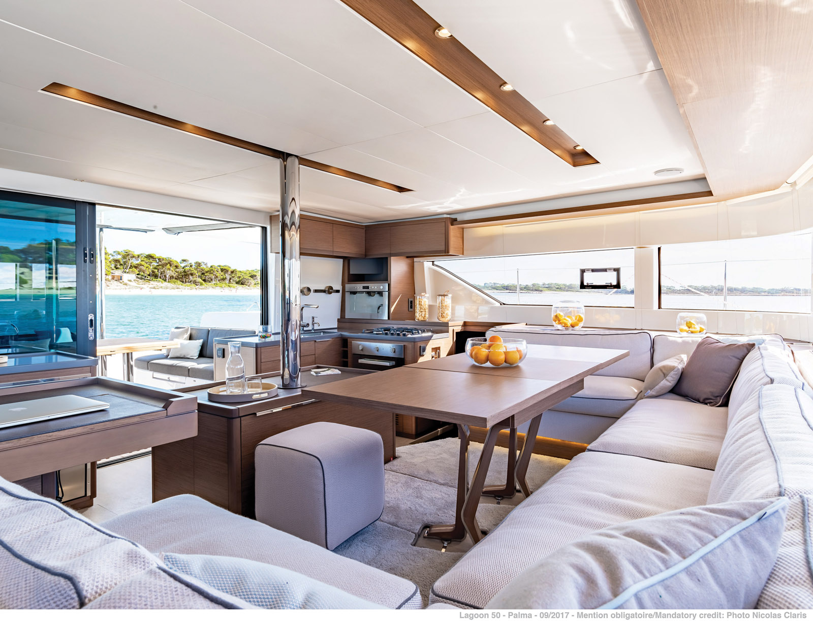 La nacelle, comme à bord de tous les Lagoon, offre un volume maximal et une excellente protection contre le rayonnement solaire grâce aux hublots verticaux. On est immédiatement conquis par la luminosité intérieure, la vue quasi panoramique et la qualité générale de la finition. En revanche, contrairement à la tendance actuelle, l’ouverture côté cockpit n’est pas très large ; si la baie vitrée offre bien 1,50 m en position ouverte (soit 3 m de surface vitrée au total sur l’arrière), la largeur de passage utile se limite à 89 cm – la faute aux deux meubles cuisine en L, dont les retours « mordent » sur l’ouverture. Une configuration qui est sans doute la conséquence de l’épontille, elle-même solidaire d’un meuble central. Du coup, le carré en U (table de 185 cm par 75 cm) est très avancé. A tribord, la table à cartes est de bonne taille – 75 cm par 62 cm –, mais orientée dos à la route. Et les cabines ? Le constructeur en propose 3, 4 ou 6. La première version propose toute la coque tribord au propriétaire avec lit queen size (1,60 m de largeur à la tête), pléthore de rangements, un dressing comme à la maison, un bureau, et enfin une magnifique salle de bain avec deux lavabos.