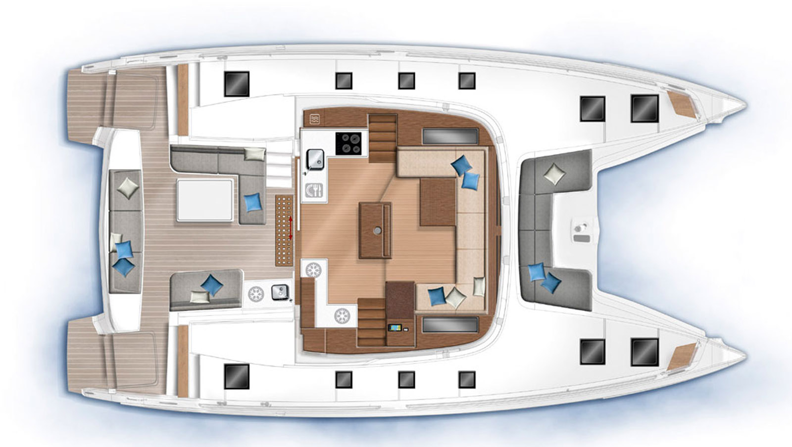 Ici aussi, la trame des aménagements est identique à celle du Lagoon 50. On relève donc la même entrée relativement étroite, la cuisine en L et le carré surélevé… à un détail près : le meuble de desserte central a disparu, au profit d’une banquette de carré plus avancée avec une table de 140 cm par 60 cm qui se dédouble. Idem pour le retour de banquette bâbord, remplacé par un meuble de rangement. Cette nouvelle organisation a notre préférence : elle libère la circulation dans la nacelle. Le traitement de la finition et de la décoration est totalement différent. Les matériaux nobles – essences de bois sombres, inox et cuir - tout comme la sellerie moelleuse, sont remplacés par des boiseries plus claires, des plaquages blancs et des coussins plus sobres. Une ambiance plus jeune, plus décontractée… on aime ou on n’aime pas, à vous de voir ! Les possibilités quant aux cabines (de 3 à 6) sont identiques. On retrouve dans les coques ce même souci de simplification – plus de fargues autour des couchettes, par exemple –, mais tous les lits conservent 1,60 m de largeur.