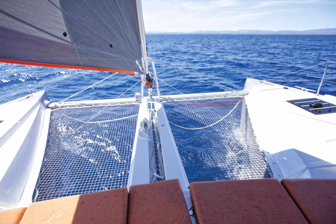 Ce qui différencie le plus l’Excess 15 du Lagoon 50, ce sont les deux postes de barre : le constructeur a installé une barre à roue à l’arrière de chaque coque et un siège double rabattable (1,47 m) – dont la finition mériterait un petit effort. On goûte un vrai plaisir de barre, d’autant que le 15 parvient malgré son déplacement encore conséquent à offrir des vraies sensations de glisse. Seconde nouveauté : le bimini rigide est décapotable sur toute sa partie centrale : un vrai bonheur ! Une bonne idée piquée aux Sense, une ancienne gamme de monocoques Bénéteau. Pour le reste du plan de pont, on retrouve peu ou prou celui du Lagoon 50 : une grande table de cockpit (85 cm x 162 cm), une belle banquette arrière de 2,40 m, des passavants larges (82 cm au plus étroit), et enfin un pontage avant et des trampolines bien dégagés.